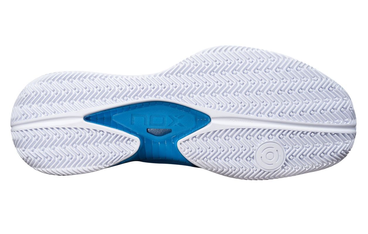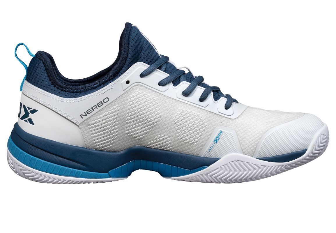 Мужские кроссовки для Падел NOX Nerbo - white/swedish blue. Обувь NOX была специально разработана для минимизации риска травм и оптимизации производительности игрока на падельном корте. Протестирована в лаборатории, имеет клинические сертификаты Центра Технологий Обуви INESCOP в Аликанте, Испания. В модели NOX Nerbo использована интегрированная конструкция язычка с встроенным внутренним носком, что максимизирует уровень поддержки и посадки на стопу пользователя. Магазин tennis-24.ru предлагает только оригинальные кроссовки NOX, чтобы вы могли быть уверены в качестве и надежности вашей экипировки. Применение технологии LATERAL SUPPORT дополнительно увеличивает стабильность, особенно при боковых движениях. Верх выполнен из дышащей сетки и имеет эластичные резиновые усиления ABRAXONE в наиболее подверженных истиранию зонах пальцев и внутренней стороны стопы. Внутренняя стелька ORTHOLITE с антибактериальными свойствами и уменьшающая ощущение усталости обеспечивает отличный комфорт во время игры, а технология AGG, расположенная под пяткой, снижает перегрузки и способствует амортизации. Протектор Optimal GRIP гарантирует отличное сцепление с поверхностями падельных кортов.