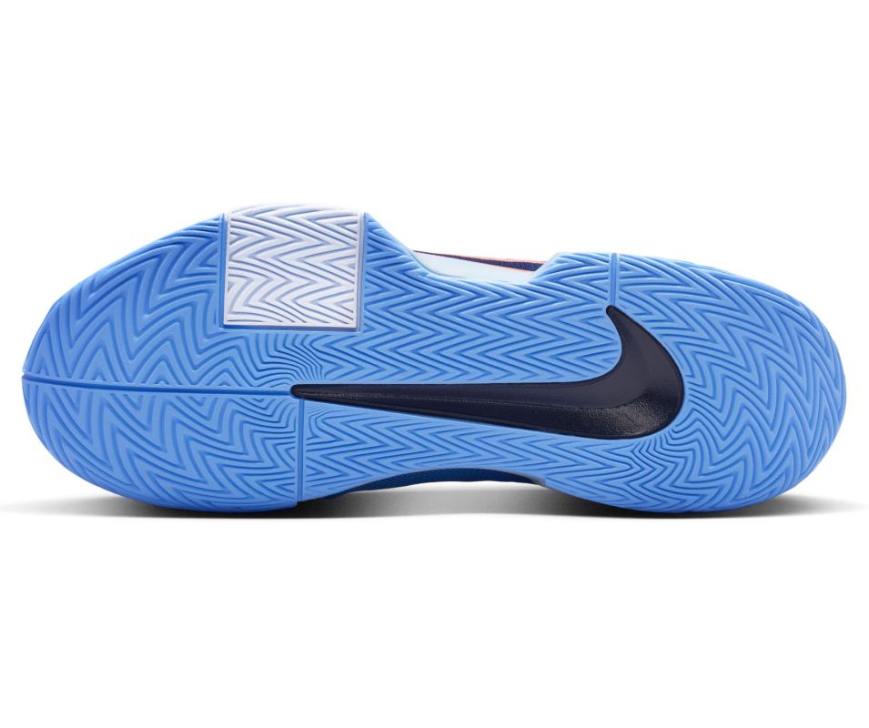Теннисные кроссовки Nike Zoom GP Challenge Pro - university blue/midnight navy/white. Модель разработана на основе ценимых игроками особенностей обуви Nike Air Zoom GP Turbo. Позволяет справляться с агрессивными движениями на корте, обеспечивая скорость и поддержку без ущерба комфорту. Оснащена единицей ZOOM AIR, расположенной под пяткой, которая обеспечивает еще большую динамику при добегании до удара и дополнительно стабилизирует пятку. Мягкая пена под передней частью стопы гарантирует амортизацию высшего класса. Верх из синтетической сетки и частично интегрированный язычок из сетчатого материала улучшают воздухопроницаемость и прилегание к стопе. Прочная резиновая внешняя подошва усилена в местах, особенно подверженных износу, и имеет более широкую основу, повышающую стабильность при движении. Модель с универсальной подошвой.