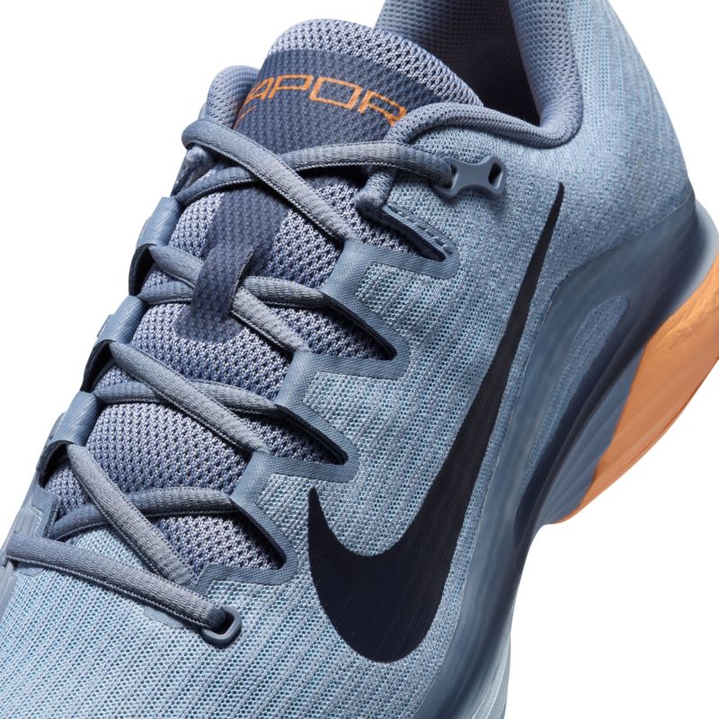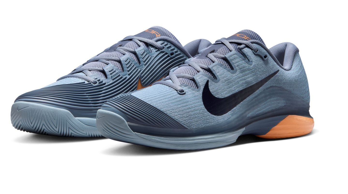 Теннисные кроссовки Nike Zoom Vapor 12 - ashen slate/obsidian. Двенадцатое обновление культовой серии обуви Air Zoom Vapor было проведено на основе отзывов как профессиональных игроков, так и любителей, а также с учетом данных об износе обуви на примере Holger Rune. Модель обеспечивает еще большую легкость и динамику перемещений при сохранении высокого комфорта и отличной стабильности. Усовершенствованный верх из сетки высокой плотности обеспечивает превосходную воздухопроницаемость, а усиления из литого полиуретана в ключевых зонах защищают наиболее подверженные истиранию участки на внутренней стороне и вокруг пальцев без увеличения веса. Прочная пластина, охватывающая среднюю часть стопы, отлично поддерживает ногу, гарантируя уверенность при резких скольжениях, поворотах и сменах направления. Внутренняя полуносочная часть улучшает посадку, дополнительно стабилизируя стопу сбоку. Применение под пяткой проверенной воздушной подушки Zoom Air обеспечивает высший уровень амортизации с динамикой отскока и упругостью для следующего шага. Благодаря профилю протектора внешняя подошва универсального назначения не ограничивает скольжения на твердых покрытиях, а ее разделенная конструкция позволяет дополнительно уменьшить вес обуви.