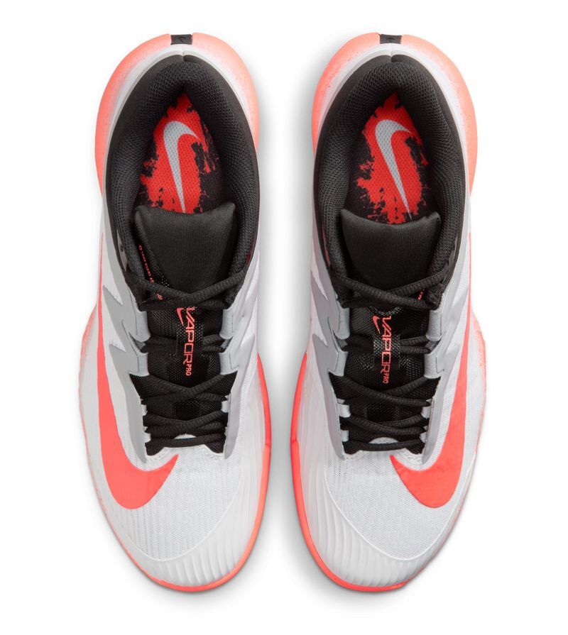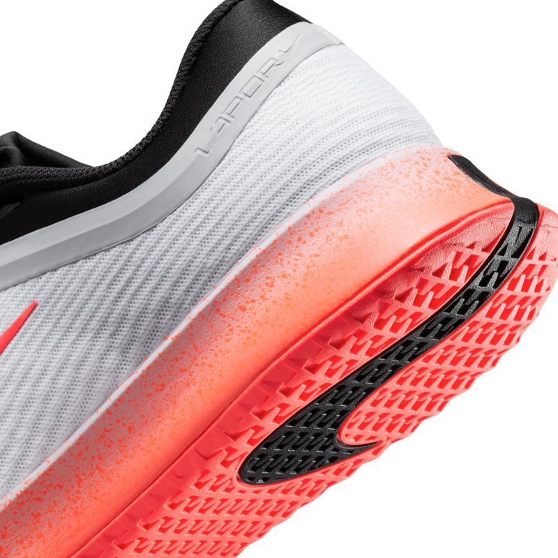 Теннисные кроссовки Nike Zoom Vapor Pro 3 HC Premium - white/hot lava/wolf grey. Третье издание культовой модели Vapor Pro приносит улучшения и инновации, внесённые инженерами Nike на основе предложений как профессиональных, так и любительских теннисистов. Сохранилась по-прежнему ценимая исключительная лёгкость обуви, которая позволяет быстро передвигаться по корту, одновременно улучшая уровень поддержки стопы при молниеносных поворотах и комфорт при длительном ношении. Специально для покупателей tennis-24.ru конструкция верхней части из прочной сетки обеспечивает отличную вентиляцию. Эластичная резиновая окантовка вокруг носка и наиболее подверженной истиранию боковой внутренней области увеличивает долговечность. Удаление резины из менее подверженных износу зон минимизирует вес обуви. Язык с частично интегрированной со внутренним чулком структурой и полный ремешок в зоне средней части стопы, позволяющий сильнее затянуть шнурки, обеспечивают улучшенную посадку и ещё более надёжно фиксируют стопу при резких сменах направления. Газовая подушка ZOOM AIR, размещённая в средней подошве, предлагает очень хорошую амортизацию с отличной упругостью шага. Дополнительно уменьшение размера подушки улучшило гибкость и сцепление передней части обуви, что облегчает естественное сгибание при отталкивании и максимизирует динамичность отскока. Благодаря профилю протектора, подошва универсального назначения не ограничивает возможность скольжений на твёрдых покрытиях.