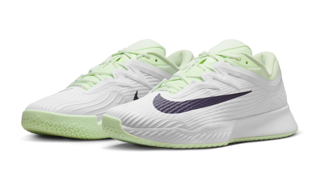 Теннисные кроссовки Nike Zoom Vapor Pro 3 - white/dark raisin/volt tint. Третья версия культовой модели Vapor Pro приносит улучшения и инновации, введенные инженерами Nike на основе предложений как профессиональных, так и любительских теннисистов. Сохранена столь ценимая исключительная легкость обуви, которая позволяет быстро перемещаться по корту, одновременно улучшая уровень поддержки стопы при молниеносных поворотах и комфорт во время ношения весь день. Конструкция верха из прочной сетки гарантирует отличную вентиляцию. Эластичная резиновая накладка вокруг носка и наиболее подверженной истиранию боковой внутренней области повышает долговечность. Удаление резины из зон, менее подверженных износу, минимизирует вес обуви. Язык с частично интегрированной структурой с внутренней носочкой и полный ремешок в области срединной части стопы, который позволяет сильнее затянуть шнурки, обеспечивают улучшенную посадку и еще более стабильно удерживают стопу во время резких изменений направления. Газовая подушка ZOOM AIR, расположенная в средней подошве, предлагает очень хорошую амортизацию с отличной упругостью шага. Кроме того, уменьшение размера подушки улучшило гибкость и сцепление передней части обуви, что облегчает естественное сгибание при отталкивании и максимизирует динамику отскока. Ввиду профиля протектора, внешняя подошва универсального назначения не ограничивает возможности скольжений на твердых покрытиях.
