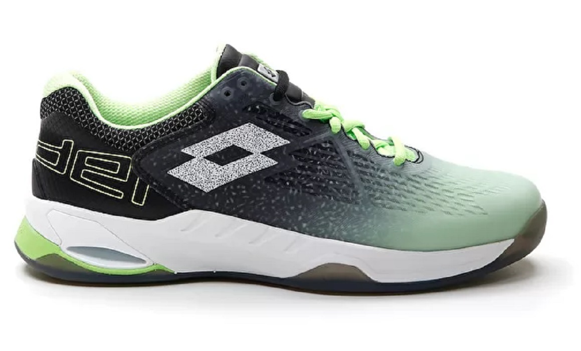 Мужские кроссовки для падла Lotto Superrapida 100 M - green apple/neo/all white/all black. Легкая, очень прочная обувь, предназначенная для игры в падла, благодаря профилю протектора, идеально подходящему для искусственного газона. Отличная вентиляция благодаря многочисленным сетчатым панелям, заключенным в прочную и стабильную резиновую конструкцию. Подошва, оснащенная технологией Enerturn, обеспечивает энергичное отскакивание стопы при каждом контакте с поверхностью. Также используются следующие технологии: 3-S, PUNTO FLEX, SYN-PULSE, BFC.