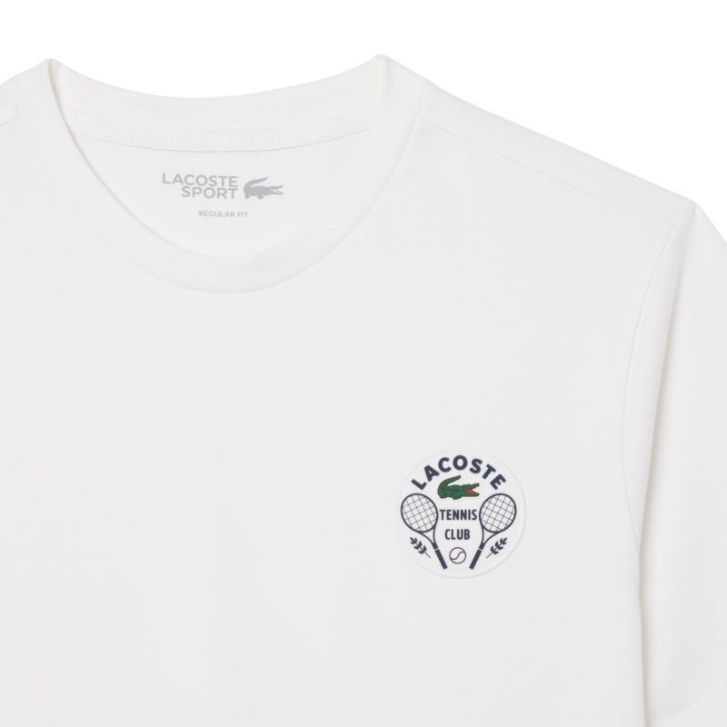 Теннисная футболка Lacoste Ultra Dry Tennis Heritage Badge - белая. Легкая футболка выполнена в простом, классическом крое, обеспечивающем высокий комфорт при носке. Слегка эластичный материал хорошо прилегает к телу, обеспечивая свободу движений во время игры. На сайте tennis-24.ru вы найдете эту модель, изготовленную из дышащего, эффективно отводящего влагу материала с применением технологии ULTRA DRY. Высокое качество изготовления и используемых материалов.