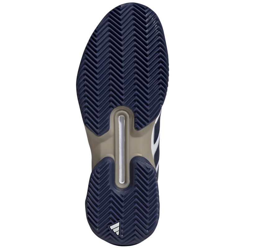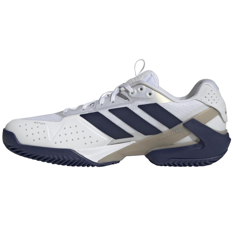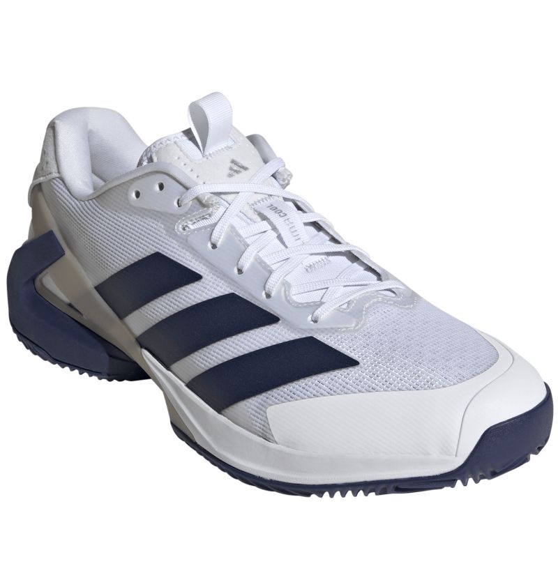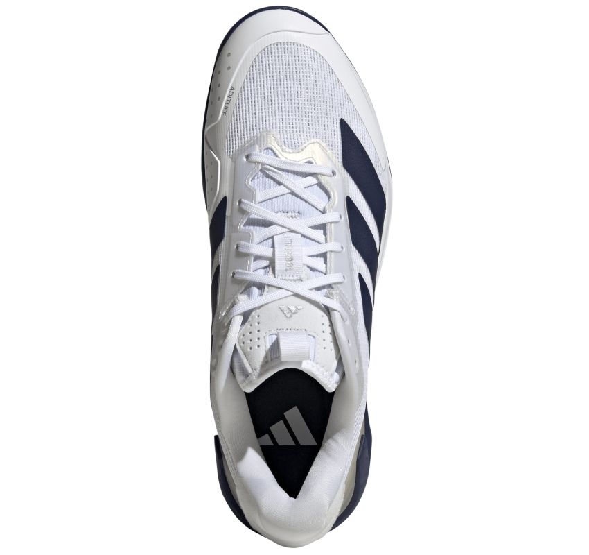 Теннисные кроссовки Adidas Adizero Ubersonic 5 M Clay - cloud white/dark blue. Пятая генерация невероятно легкой и быстрой обуви Ubersonic была оптимизирована для обеспечения стабильности большей, чем когда-либо. Заимствованная из футбольных и регбийных бутс конструкция SPEEDFRAME надежно стабилизирует пятку и среднюю часть стопы, гарантируя максимальную боковую поддержку при быстрых изменениях направления на корте. Интегрированный плетеный язычок с профилированным воротником пятки обеспечивает идеальную посадку. Верх из тонкой сетки с крупными ячейками и бесшовной структурой предлагает отличную воздухопроницаемость, а вырез в внешней подошве дополнительно увеличивает вентиляцию. Применение усилений из легкой резины ADITUFF позволяет добиться большей защиты от истирания вокруг пальцев при сохранении легкости. За хорошую амортизацию отвечает мягкая резиновая промежуточная подошва с технологией LIGHTSTRIKE. Внешняя подошва из твердой резины в технологии ADIWEAR гарантирует отличную износостойкость и сцепление. Модель имеет подошву, предназначенную для игры на грунтовых кортах.