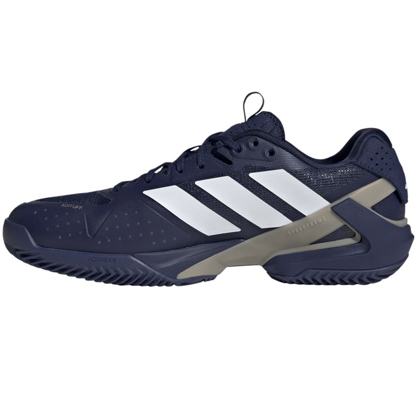 Теннисные кроссовки Adidas Adizero Ubersonic 5 M Clay - dark blue/cloud white/cyber metallic. Пятая генерация невероятно лёгкой и быстрой обуви Ubersonic была оптимизирована для обеспечения стабильности большей, чем когда-либо. Заимствованная из футбольных и регбийных бутс конструкция SPEEDFRAME надёжно стабилизирует пятку и среднюю часть стопы, гарантируя максимальную боковую поддержку при быстрых изменениях направления на корте. Интегрированный плетёный язычок с профилированным воротником пятки обеспечивает идеальную посадку. Верх из тонкой сетки с крупными ячейками и бесшовной структурой предлагает отличную воздухопроницаемость, а вырез во внешней подошве дополнительно увеличивает вентиляцию. Применение усилений из лёгкой резины ADITUFF позволяет получить большую защиту от истирания вокруг пальцев при сохранении лёгкости. За хорошую амортизацию отвечает мягкая резиновая средняя подошва с технологией LIGHTSTRIKE. Внешняя подошва из твёрдой резины в технологии ADIWEAR гарантирует необходимую износостойкость и сцепление. Модель имеет подошву, предназначенную для игры на грунтовых кортах.