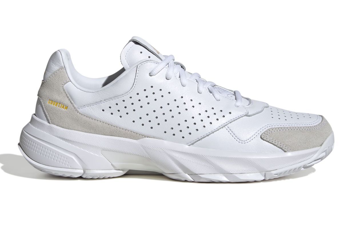 Теннисные кроссовки Adidas CourtJam Control 3 Premium - cloud white/cloud white. Легкая, дышащая модель с классической шнуровкой. Кожаный верх, дополненный многочисленными перфорациями, обеспечивает хорошую циркуляцию воздуха и оптимальную прочность и поддержку стопы. Зоны, наиболее подверженные истиранию, дополнительно усилены замшевым материалом. Очень хорошая стабилизация и амортизация благодаря применению под пяткой технологии CloudFoam+. Обувь оснащена подошвой, предназначенной для игры на различных покрытиях. Использованы следующие технологии: BOUNCE, ADIWEAR, TORSION SYSTEM, ADITUFF.