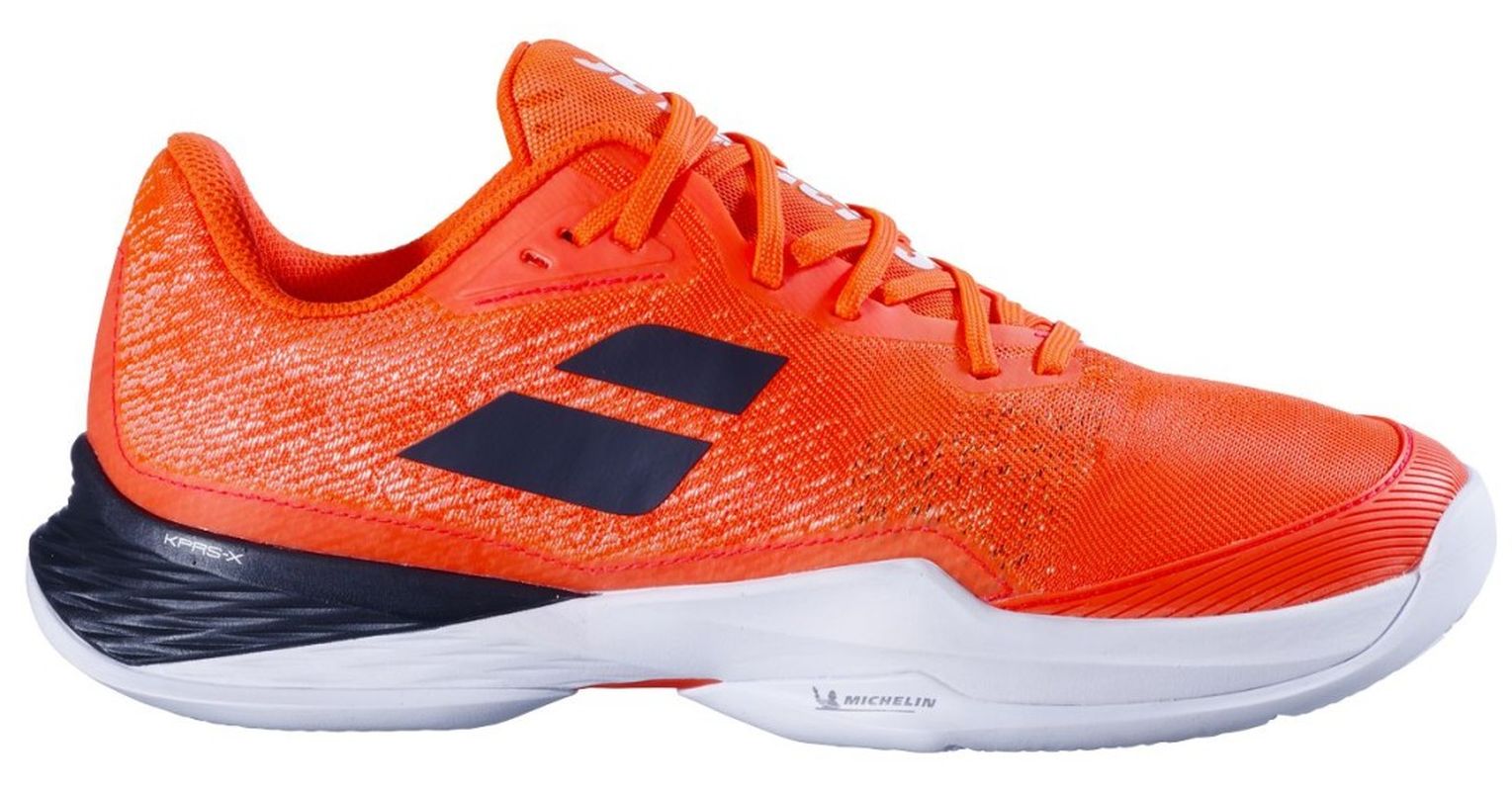 Теннисные кроссовки Babolat Jet Mach 3 Clay - strike red/white. Babolat Jet Mach 3 — одна из абсолютно самых легких моделей обуви на теннисном рынке. Мягкий сетчатый верх обеспечивает хорошую воздухопроницаемость. Еще большая стабилизация и комфорт использования благодаря технологии KPRS-X, расположенной под пяткой. Верхняя часть кроссовка выполнена из одного куска. Технология Matryx 2.0 делает кроссовок более прочным, чем его предшественник. Полиамидные волокна соединены с Kevlar, а затем усилены монофиламентными волокнами, что в итоге дает чрезвычайно долговечный материал и фантастическую поддержку стопы. Дополнительная стабилизация за счет выступа подошвы наружу в виде так называемой стопки. Более толстая внешняя подошва Michelin обеспечивает отличное сцепление. Это идеальный выбор для игроков, ищущих скорость и комфорт. Кроссовок с подошвой, предназначенной для игры на грунтовых кортах.