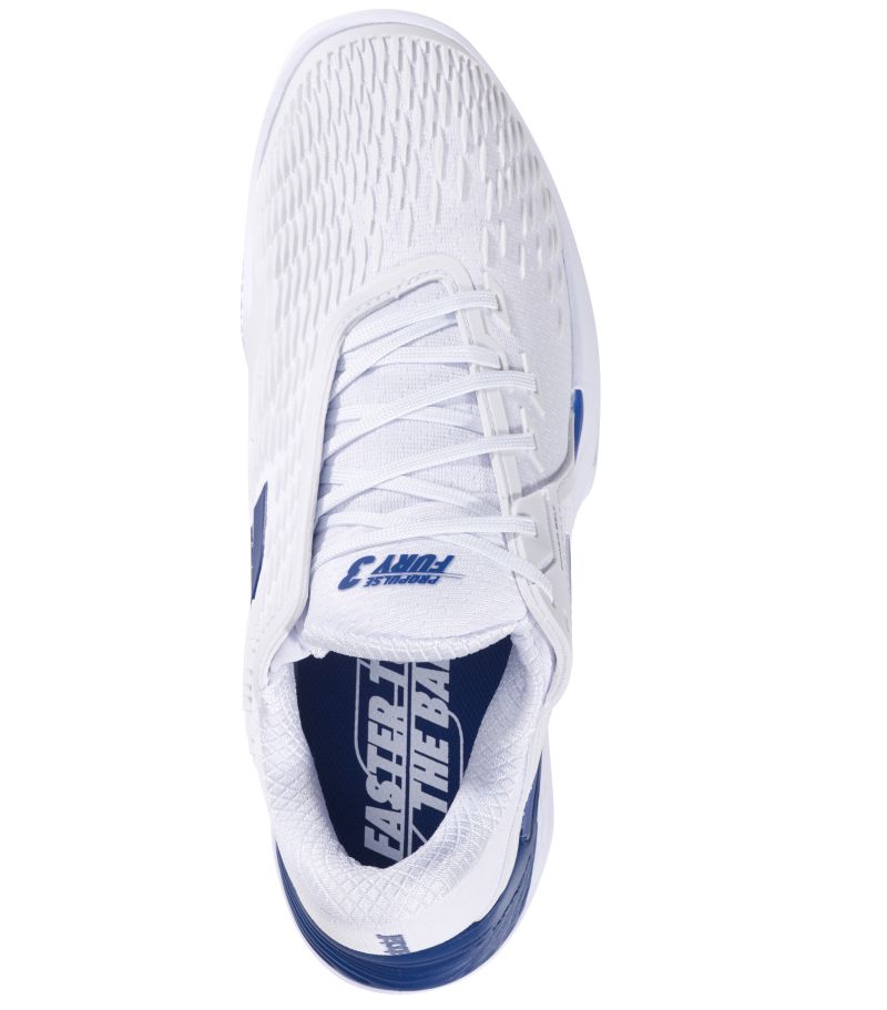 Теннисные кроссовки Babolat Propulse Fury 3 Clay - white/dark blue. Третье поколение известной серии обуви Propulse Fury. Обеспечивает отличную стабильность и защиту, а новая версия позволяет увеличить прочность, комфорт и скорость передвижения. Инновационная конструкция верха с использованием полиуретанового покрытия обеспечивает лучшую долговечность и больший комфорт. Повышенная защита пятки и высокий подъем гарантируют феноменальную фиксацию стопы. Интегрированный язычок предлагает очень хорошую посадку и дополнительную поддержку. Носок расширен, благодаря чему дополнительно увеличился комфорт использования, особенно во время длинной и изнуряющей игры. Совершенно новая подошва имеет более динамичную форму и утолщения в местах, подверженных истиранию. Ремень Power Belt увеличивает боковую стабильность, надежно удерживая область пятки и середины стопы. Наружная подошва из прочной резины Michelin обеспечивает долговечность и хорошее сцепление, а использование пены EVA гарантирует отличную амортизацию. Другие используемые технологии: ORTHOLITE, KPRS-X, GEN-PROTECT, 360 INSOCK CONSTRUCTION. В связи с профилем протектора обувь предназначена для игры на грунтовых кортах.