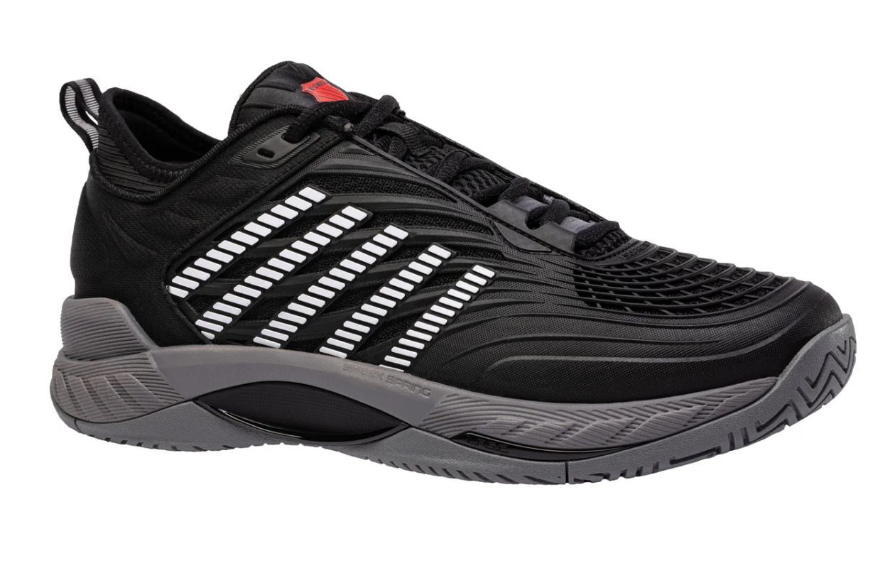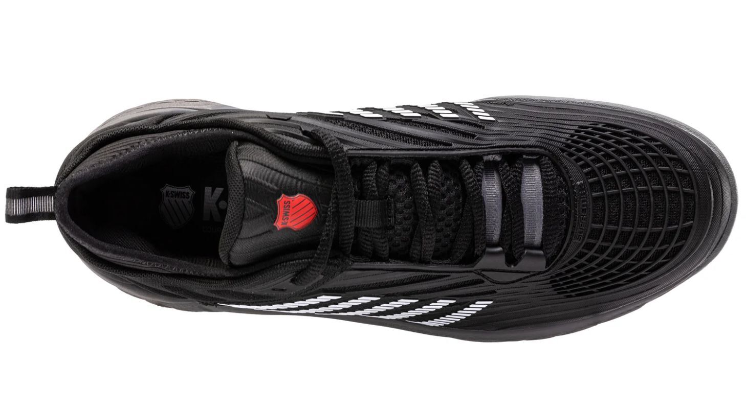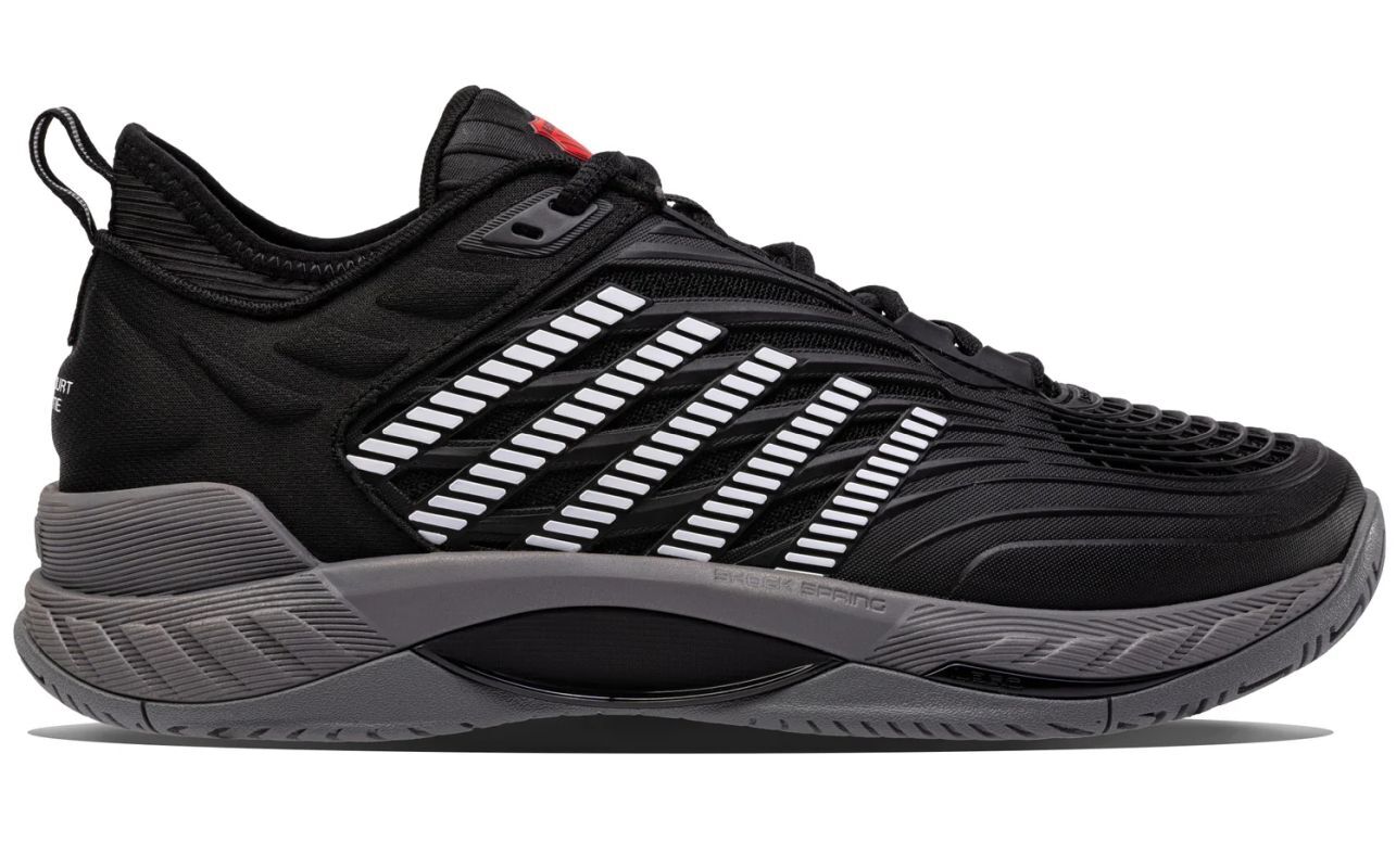 Обновление самой быстрой модели теннисной обуви K-Swiss позволяет повысить уровень прочности и комфорта при сохранении исключительной легкости. Переосмысленный верх из сетки, покрытый эластичным резиновым слоем DuraWrap X, обеспечивает очень хорошую поддержку стопы и стабильность, оптимальную дышимость и лучшую, чем в предыдущей версии, износостойкость. Язык с частично интегрированной конструкцией повышает уровень посадки, а укрепленная область пятки обеспечивает большую прочность и дополнительную стабилизацию. Средняя подошва из отзывчивой пены Shock Spring обеспечивает отличную амортизацию вместе с очень хорошим возвратом энергии при движении. Внешняя подошва сочетает сцепление и прочность с надежной работой на любом покрытии корта и оснащена системой non-marking. Также применены технологии: Dragguard 7.0, Surgelite, 180 PSC (Plantar Support Chassis).