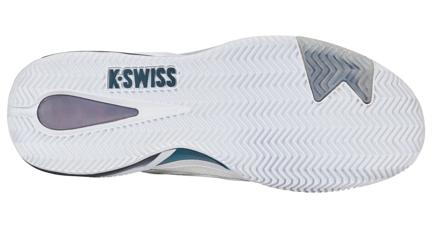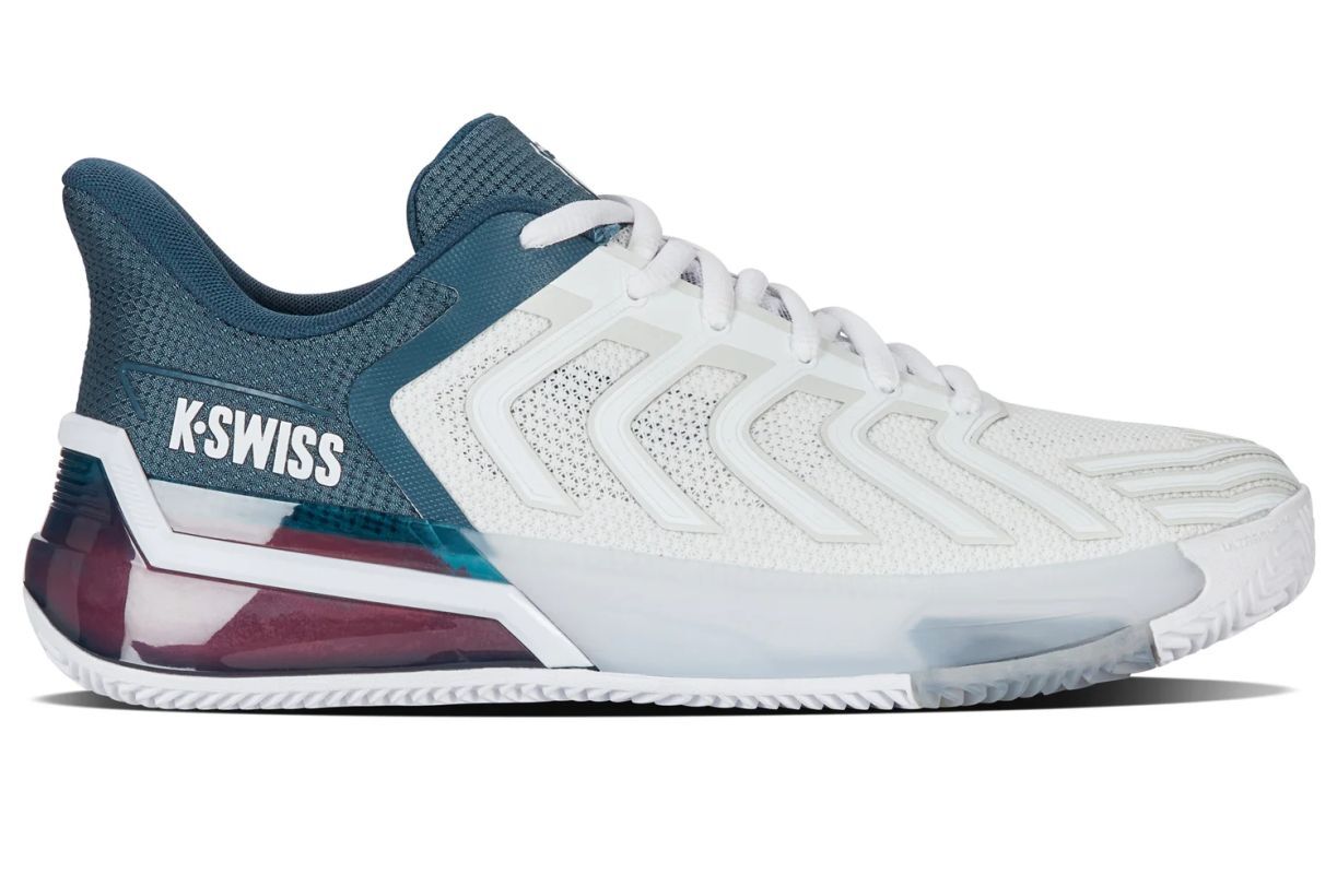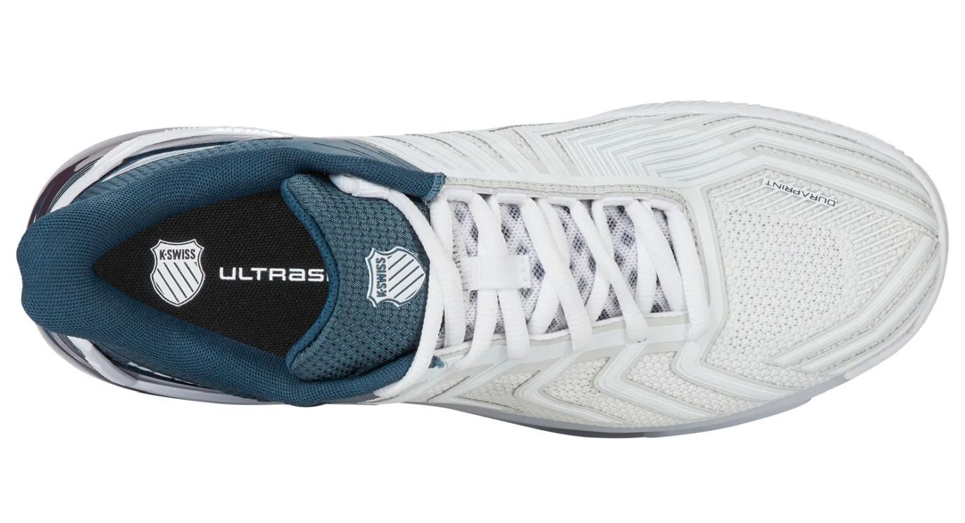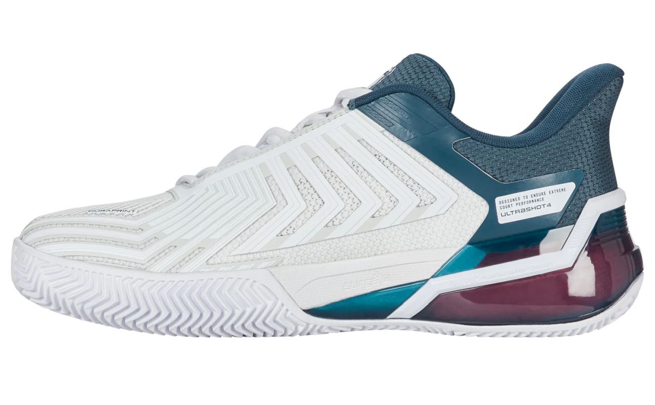 Теннисные кроссовки K-Swiss Ultrashot 4 - white/stargazer/neon blaze. Самый прочный и стабильный бутс из серии K-Swiss, наиболее часто выбираемый профессиональными игроками. Дышащий верх из сетки обеспечивает комфорт и удобство, а также дополнительно усилен специальным материалом Duraprint, чтобы защитить ноги от потертостей на корте во время движения. Магазин tennis-24.ru предлагает эту модель для тех, кто ценит надежность и инновации. Мягкая чашка под пяткой Shock Frame обеспечивает идеальное прилегание ноги с сохранением полной стабильности. Средняя подошва с исключительно пружинистой пеной обеспечивает очень хорошую амортизацию, а также динамику отскока и возврата энергии, вкладываемой в движение. Внешняя подошва с универсальным протектором подойдет для любой поверхности. Она была разработана так, чтобы обеспечить максимальную долговечность без дополнительного обременения. Технология DuraWrap в местах, особенно подверженных износу, увеличивает долговечность. Верхняя часть из TPU в середине ноги обеспечивает стабильность при быстрых движениях и поворотах. Примененные технологии: Surge 7.0, Draggaurd 7.0, 360 PSC.