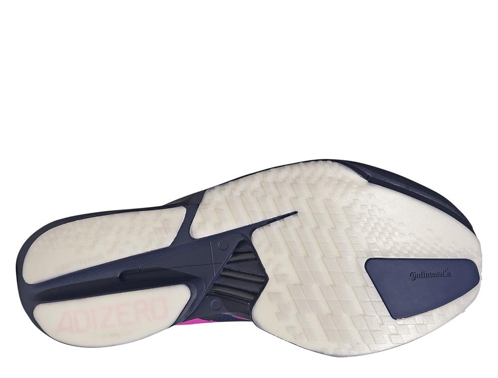 Задник/верх обуви кроссовок выполнен из текстильно-синтетического материала, который обеспечивает отличную воздухопроницаемость и минимальный вес, позволяя сосредоточиться исключительно на преодолении километров, а не на обуви. Стандартный крой и традиционная шнуровка гарантируют надежную и удобную посадку. Эстетику обуви подчеркивают три динамичные полоски adidas ярко-розового цвета, контрастирующие с темно-синей основой, что придает обуви гоночный характер.