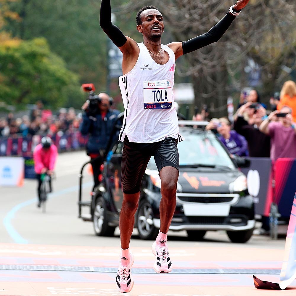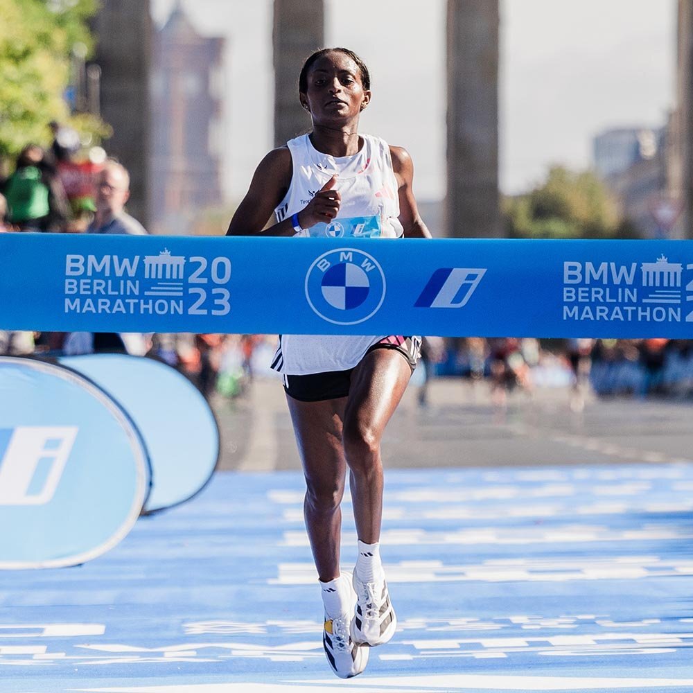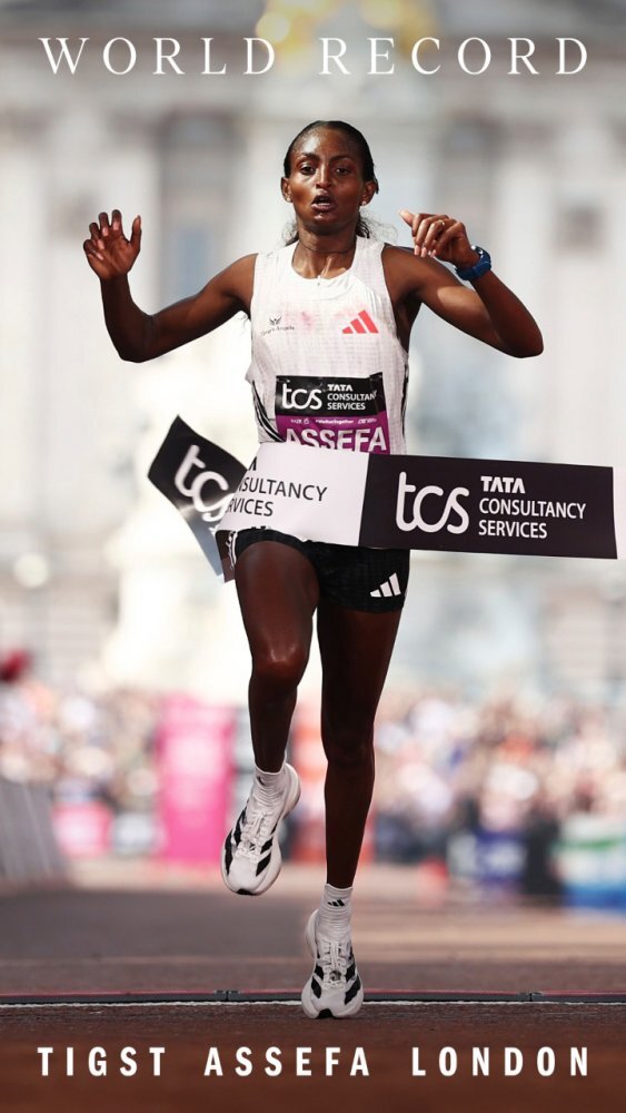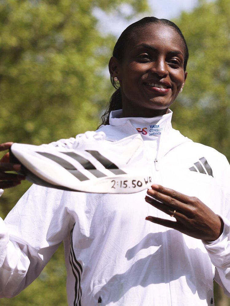 Tigst Assefa побил мировой рекорд во время марафона в Лондоне 2025, пробежав дистанцию за 2:15:50 в кроссовках Adizero Adios Pro Evo 1.