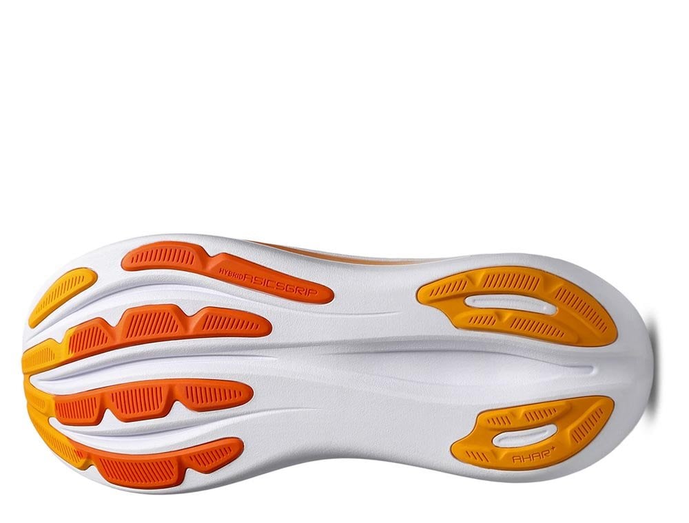 Подошва HYBRID ASICSGRIP сочетает резину ASICSGRIP с прочным материалом AHARPLUS, обеспечивая отличное сцепление на асфальте и стабильность даже на длинных пробежках. Благодаря использованию переработанных материалов и технологии окрашивания с ограниченным потреблением воды, Nimbus 28 имеет на 36% меньший углеродный след, чем средний по отрасли.