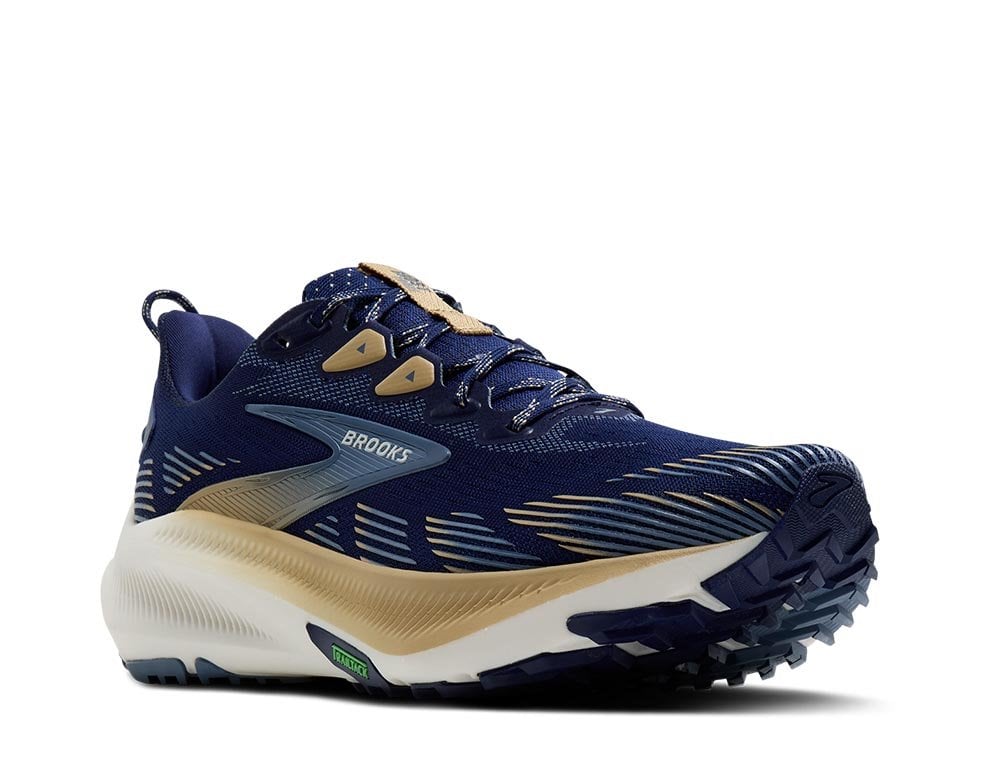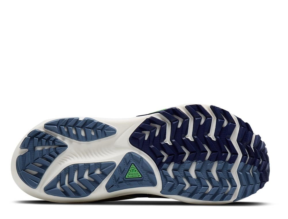 Внешняя часть подошвы кроссовок Brooks Ghost Trail выполнена из резины TrailTack Green, которая гарантирует надежное сцепление на мокрых и сухих поверхностях. Протектор с выступами около 3 мм улучшает сцепление и стабильность на лесных тропах, гравии или смешанных покрытиях, что делает кроссовки подходящими для активностей типа road-to-trail.