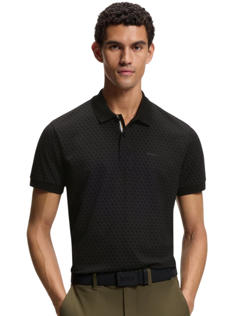 Мужское поло BOSS Chip Pattern - black. Простое поло, выполненное из 100% хлопкового материала, хорошо облегает тело, обеспечивая удобство ношения. Рукава и воротник с V-образным вырезом выполнены из рифлёного и растяжимого материала. Высокое качество исполнения и использованных материалов. Поло выполнено с применением технологий: Quick Dry, Moisture Management, Active Pima Cotton.