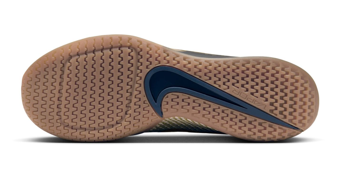 Теннисные кроссовки Nike Zoom Vapor 11 Premium - sanddrift/metallic gold/thunder blue. Следующая версия культовой серии обуви Air Zoom Vapor. Модель Vapor 11 обеспечивает идеальное сочетание комфорта, долговечности и динамики. Немного более стабильная, чем близнец Vapor Pro 2, она позволяет более безопасно агрессивно перемещаться по корту. Верх выполнен из эластичного сетчатого материала, что обеспечивает отличную воздухопроницаемость. Конструкция из mesh-панели усилена в нужных местах, сохраняя прочность. Кроме того, резиновый слой подошвы в средней части обуви приподнят, что укрепляет зоны наибольшего износа и усиливает поддержку стопы. Тонкий язычок и внутренняя носочка до половины верха облегчают надевание и снятие, повышая удобство. В передней части применяется воздушная подушка ZOOM AIR, обеспечивающая хорошую амортизацию, упругость и динамику отскока. Из зон меньшего износа убрана резина, минимизируя вес и позволяя быстрые движения и молниеносные развороты. Обувь имеет классическую шнуровку. Благодаря протектору внешняя подошва универсального типа не ограничивает скольжения на жестких покрытиях.