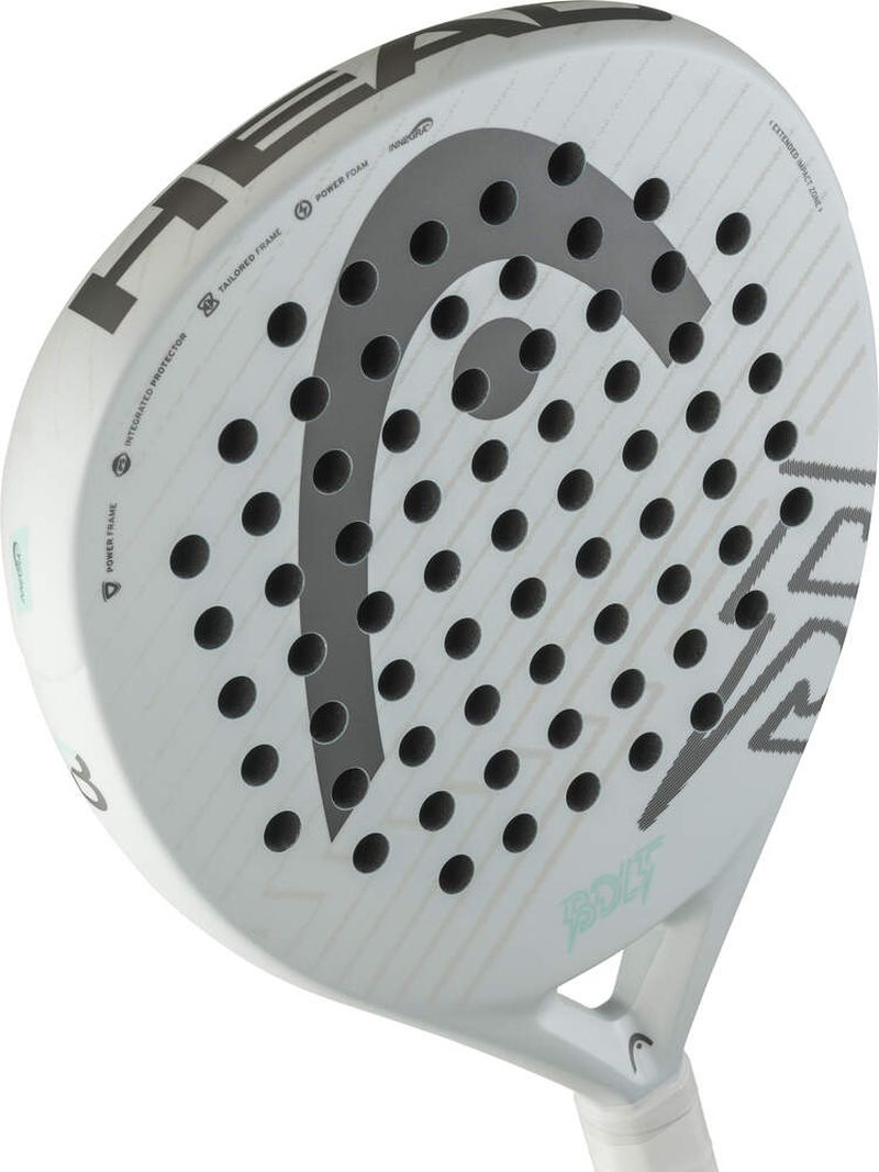 Ракетка для падел тенниса Head Bolt 2026 - white/grey. Очень хорошо сбалансированная ракетка с универсальными характеристиками, предназначенная для начинающих и рекреационно играющих любителей падела. Увеличенная головка в форме капли прощает больше ошибок и предлагает оптимальное сочетание мощности и контроля. Ее поверхность выполнена из стекловолокна и поддерживается технологией плетения волокон Innegra, обеспечивая комфортную мягкость и лучшее ощущение. Конструкция рамы Power Frame с пеной Power Foam позволяет генерировать большую динамику удара. Также применены технологии: TAILORED FRAME, INTEGRATED PROTECTOR SYSTEM (IPS).