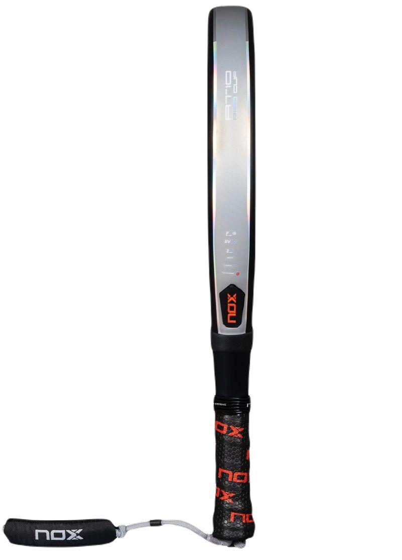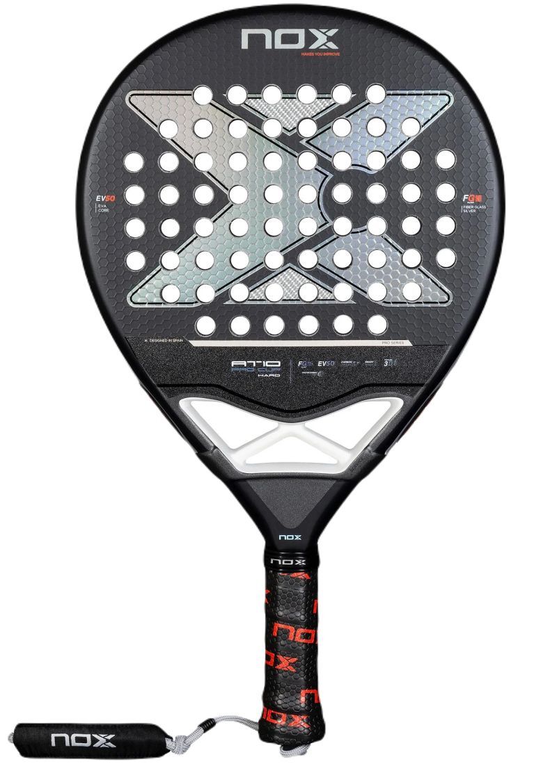 Ракетка для Padel NOX AT10 Pro Cup Hard by Agustin Tapia 2025. Модель, сочетающая признанную форму ракет из серии AT10 с комбинацией материалов и технологий, более подходящих для игроков среднего уровня. Обладает наиболее универсальным сочетанием мощности и контроля благодаря голове в форме капли и среднему балансу, что делает ракетку эффективной как в оборонительной, так и в атакующей игре. Версия Pro Cup Hard с сердечником из более твердой и более отзывчивой резины EV50 придает мячу дополнительную мощь при быстрых ударах, обеспечивая при этом более надежное ощущение. Завершает образ эффектная окраска с использованием светочувствительной краски и система сменных ремешков Smartstrap, позволяющая индивидуально персонализировать эту часть ракетки. Характеристика примененных технологий: Texture 3D - шестиугольная текстурированная поверхность 3D увеличивает потенциал для создания вращения. Рама из углеродного волокна CARBON FRAME повышает жесткость и прочность, обеспечивая большую динамику, в то время как отделка поверхности головы металлизированным стекловолокном FIBER GLASS SILVER добавляет ракетке гибкости и комфорта. AVS - ANTI VIBRATION SYSTEM - система поглощения вибраций, вызванных ударами вне sweet spot. Ракетка продается в комплекте с чехлом, оснащенным лямкой для ношения на спине.