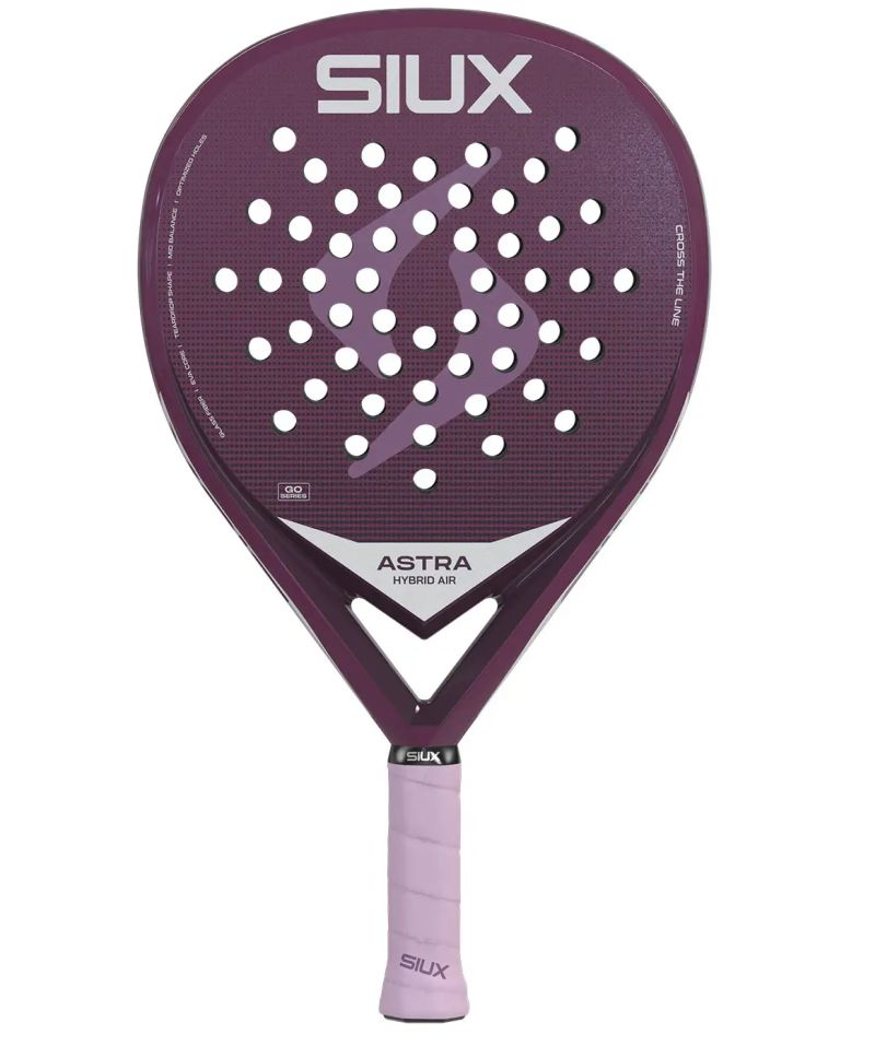 Ракетка для падел тенниса Siux Astra Hybrid Air 2026. Более лёгкая версия модели Astra Hybrid, предназначенная для среднепродвинутых или амбициозных начинающих женщин. Очень хорошо сбалансированная, комфортная и развивающая ракетка. Имеет головку в форме капли, которая вместе со средним балансом обеспечивает наиболее оптимальное сочетание мощности и контроля. Поверхность головки выполнена из эластичных стекловолокон 3K Fiberglass, что обеспечивает отличный комфорт игры и более отзывчивый отскок мяча, а её шероховатая отделка значительно облегчает нанесение вращения. Структурные усиления из карбона в внутренних слоях рамы повышают жёсткость и долговечность конструкции.
