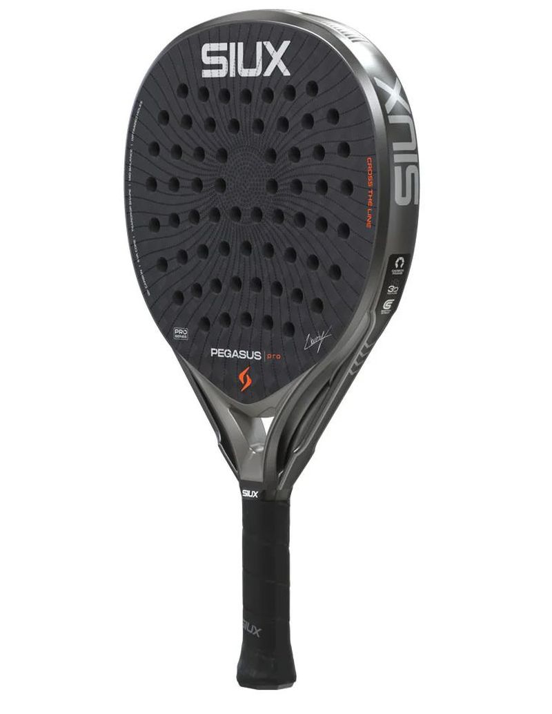 Ракетка для падел тенниса Siux Pegasus Pro 2026 - storm grey. Выбор ведущего аргентинского игрока молодого поколения, Alexa Chozasa. Ракетка Pegasus Pro предназначена для универсальных продвинутых и среднего уровня игроков со стилем игры, слегка более ориентированным на наступление и атаки. Имеет головку в форме слезинки, которая в наилучшей степени сочетает доступ к мощности и контролю при sweetspocie большем, чем в ромбовидных головках. Средне-высокий баланс и применение более жестких, отзывчивых материалов в конструкции рамы и сердечника обеспечит дополнительную динамику ударов. Самые важные особенности и технологии ракетки: