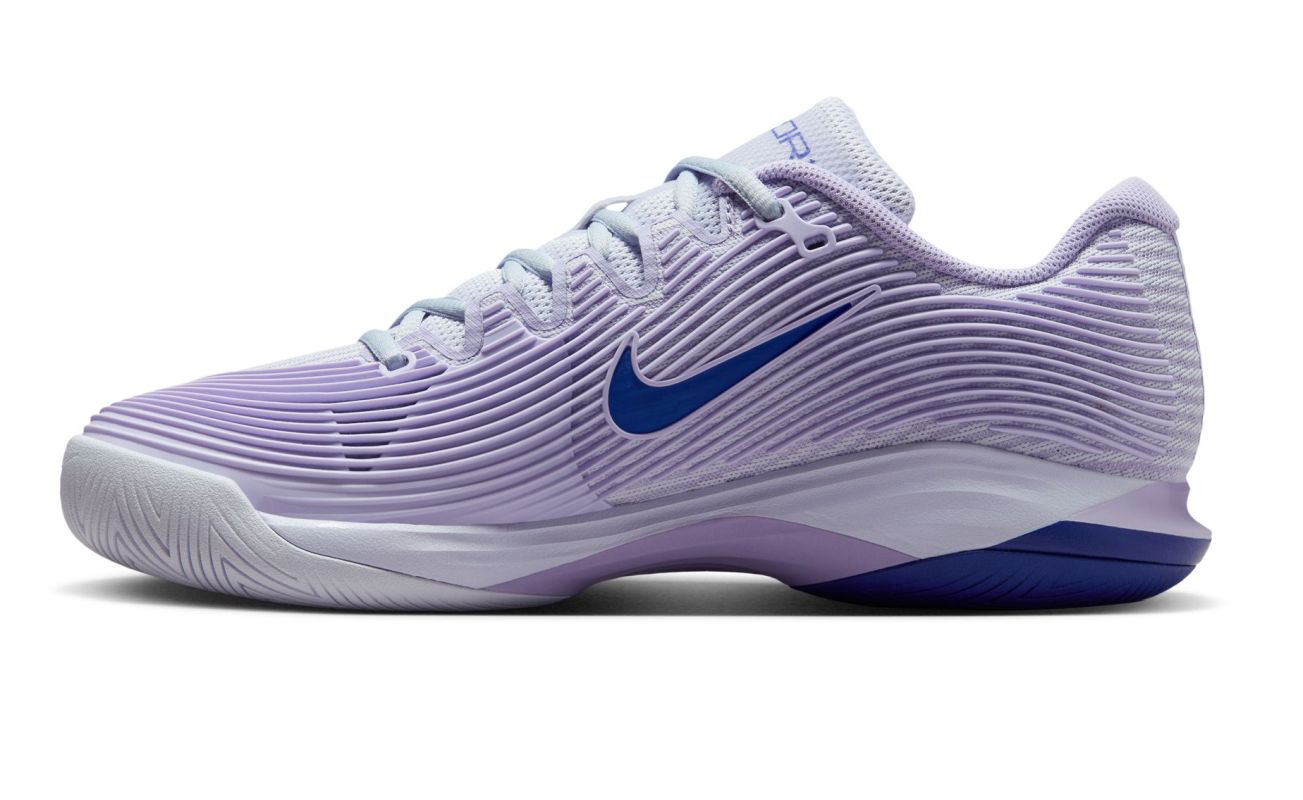 Женские теннисные кроссовки Nike Zoom Vapor 12 - amethyst tint/deep night. Двенадцатое обновление легендарной серии обуви Air Zoom Vapor было выполнено на основе отзывов как от профессиональных игроков, так и от любителей, а также с учетом данных об износе обуви на примере Holgera Rune. Модель обеспечивает еще большую легкость и динамику перемещений при сохранении высокого уровня комфорта и привычной отличной стабильности. Улучшенный верх из плотной сетки обеспечивает отличную вентиляцию, а армирование из литого полиуретана в ключевых зонах защищает самые уязвимые к истиранию места на внутренней стороне и вокруг пальцев, не увеличивая вес обуви. Крепкая пластина вокруг средней части стопы прекрасно поддерживает ногу, обеспечивая уверенность при резких скольжениях, поворотах и сменах направления. Внутренняя носочная часть до половины верха улучшает посадку, дополнительно стабилизируя стопу по бокам. Использование под пяткой проверенной воздушной подушки Zoom Air обеспечивает высочайший уровень амортизации с динамикой возврата и упругостью для следующего шага. Благодаря рисунку протектора внешняя подошва универсального применения не ограничивает возможности скольжения на жестких покрытиях, а ее сегментированная конструкция дополнительно снижает вес обуви.