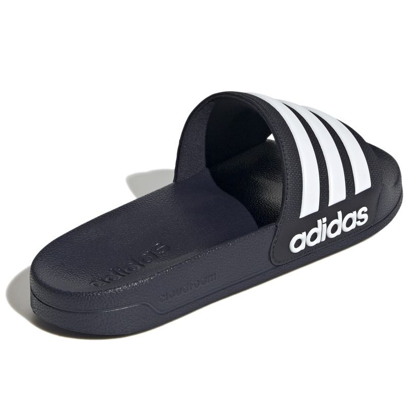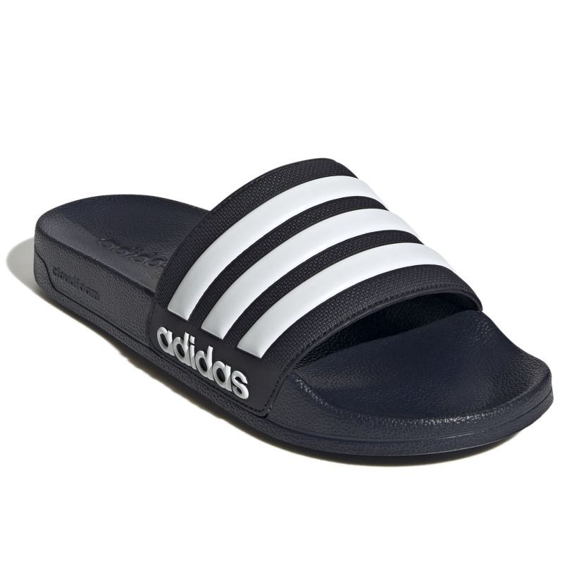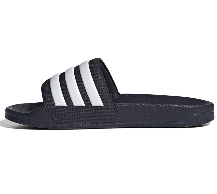 Сланцы Adidas Adilette Shower - legend ink/cloud white/legend ink. Вьетнамки классического стандартного кроя. Использование мягкой пены и внутренней подкладки ремешка обеспечивает комфорт при носке и снижает риск возникновения натираний. Противоскользящая, быстро сохнущая подошва отлично подходит для ванной комнаты или бассейна. Использована технология: CLOUDFOAM.
