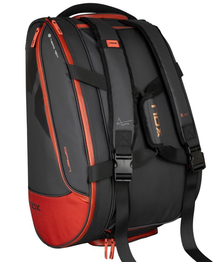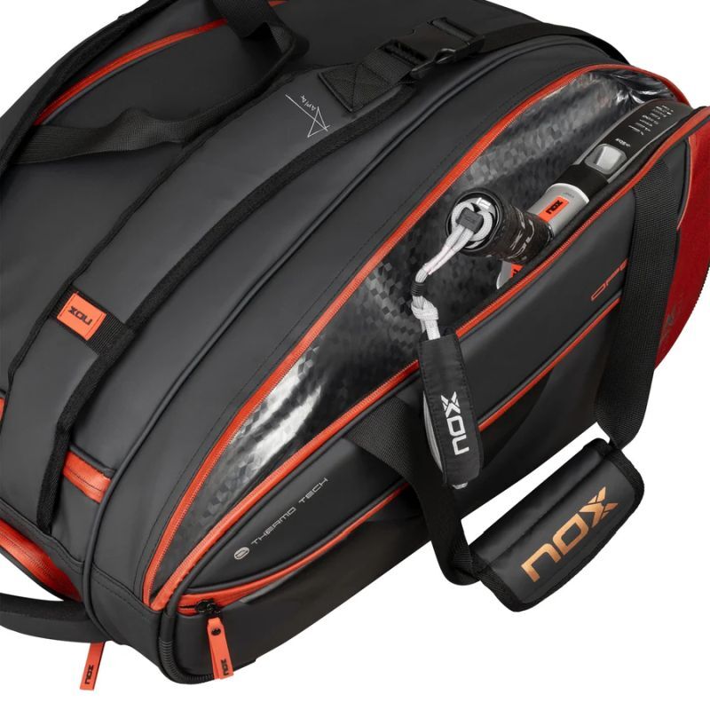 Сумка для Падел NOX Luxury Open Series - black/red. Функциональная и вместительная падел-сумка. Имеет два основных отделения. Одно из них термоактивное и вмещает до двух ракеток. В другом, необычно объемном, обеспечено много места для остального снаряжения и одежды. По обеим сторонам сумки расположены вместительные карманы для аксессуаров, а также дополнительный маленький карман внизу. На сайте tennis-24.ru вы найдете эту сумку, отличающуюся продуманной эргономикой. Отдельное, вентилируемое отделение для обуви или мокрой одежды. Сумка оснащена двумя лямками для ношения как рюкзак, складными ручками и ручкой для переноски в руке. Изготовлена из высококачественных, прочных материалов, которые прекрасно держат форму. Вместимость: 60 литров.