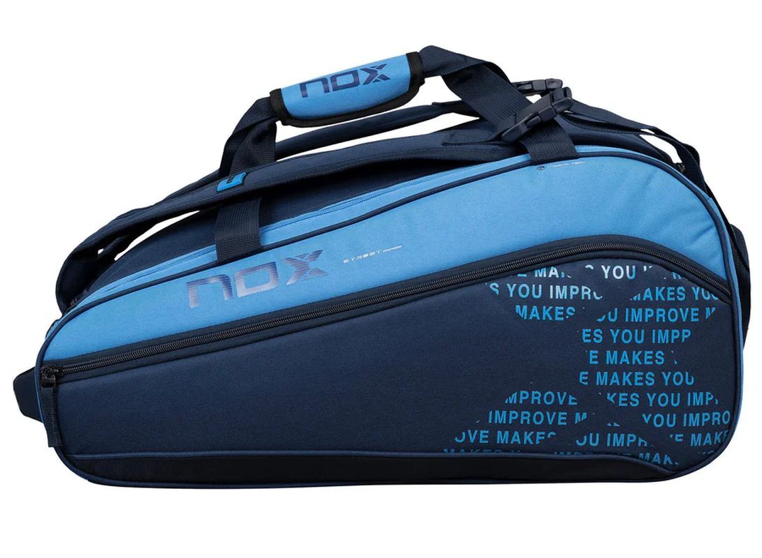 Сумка для Падел NOX Street Series - sky blue — двухсекционная сумка объемом 45 литров, сочетающая функциональность с оригинальным городским стилем. В одном из отделений есть термоизоляционная защита, позволяющая хранить 2 ракетки для падла. Магазин tennis-24.ru предлагает только качественные аксессуары для падел, и эта модель станет отличным выбором для спортсменов. В другом, просторном отделении, гарантировано много места для остального снаряжения и одежды. По обеим сторонам сумки находятся вместительные карманы для аксессуаров на молниях. Отдельное вентилируемое отделение для обуви или мокрой одежды. Сумка оснащена двумя лямками для ношения на спине как рюкзак, а также ручкой для переноски в руке. Изготовлена из высококачественных, прочных материалов, которые хорошо держат форму.