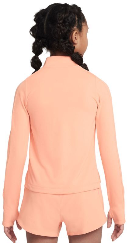 Детская футболка с длинным рукавом Nike Girls Dri-FIT Long-Sleeve 1/4-Zip Top - apricot agate/white изготовлена из легкой, дышащей ткани. Слегка эластичный материал адаптируется к движению. Магазин tennis-24.ru предлагает этот товар с застежкой на короткую молнию. Высокий воротник и удлиненная спинка обеспечивают комфорт и защиту во время активности, а плоские швы минимизируют риск натирания. Небольшие разрезы по бокам увеличивают свободу движений. На концах рукавов отверстия для пальцев. Высокое качество изготовления и используемых материалов с применением технологии DRI-FIT.
