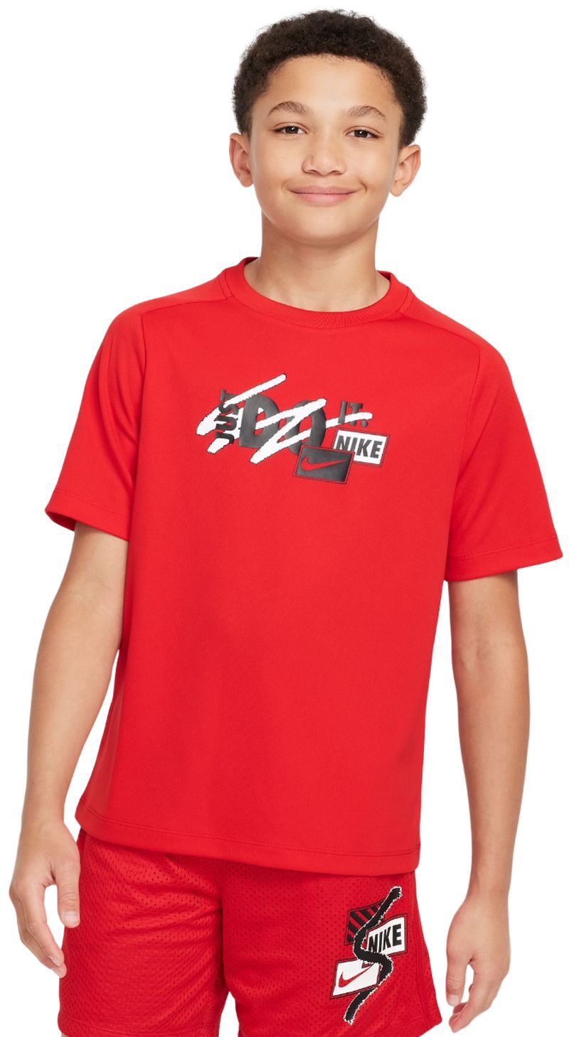 Мальчиковая футболка Nike Kids Multi Dri-Fit Top. Простой крой, классическая модель. Эластичный трикотажный материал обеспечивает хорошую посадку и комфорт во время игры. На сайте tennis-24.ru вы найдете эту модель с интересным графическим мотивом. Ребристый воротник облегчает надевание и снятие. Футболка выполнена из дышащего материала, эффективно отводящего влагу с использованием технологии DRI-FIT.