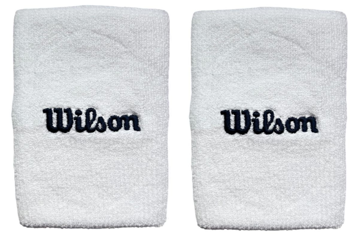 Напульсники Wilson Wide Terry. Комфортные напульсники с большим содержанием хлопка, идеально впитывают влагу, а также отлично прилегают к запястьям, обеспечивая комфорт при ношении. Посредине размещено название производителя. В упаковке две штуки. Размеры: 10 x 8 см.