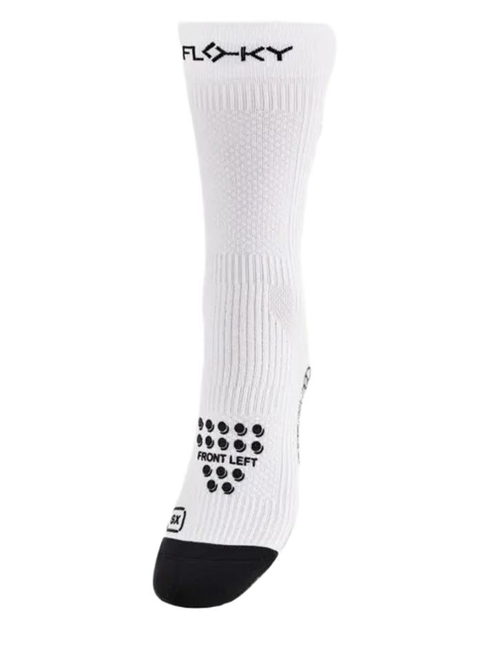Носки Floky S-Mash 3D Biomechanical 1P - белые. Инновационные биомеханические носки, специально разработанные для ракеточных видов спорта с учетом специфики перемещения на корте во время игры в теннис, падел или пиклбол. Изготовлены из эластичных и прочных волокон, полученных из вторичного сырья. Обтягивающая конструкция носков идеально прилегает к стопе, обеспечивая направленную защиту и повышая стабильность голеностопного сустава и ахиллова сухожилия. Антискользящая система с спиральными аппликациями на подошве обеспечивает отличное сцепление, надежно удерживая стопу при динамичных движениях, а специальные усиления дополнительно защищают свод стопы и головку плюсневых костей. Запатентованная компрессия подошвы FLOKY способствует выведению продуктов обмена веществ, улучшая оксигенацию мышц и предотвращая травмы. Плоские швы минимизируют риск натирания и появления мозолей.