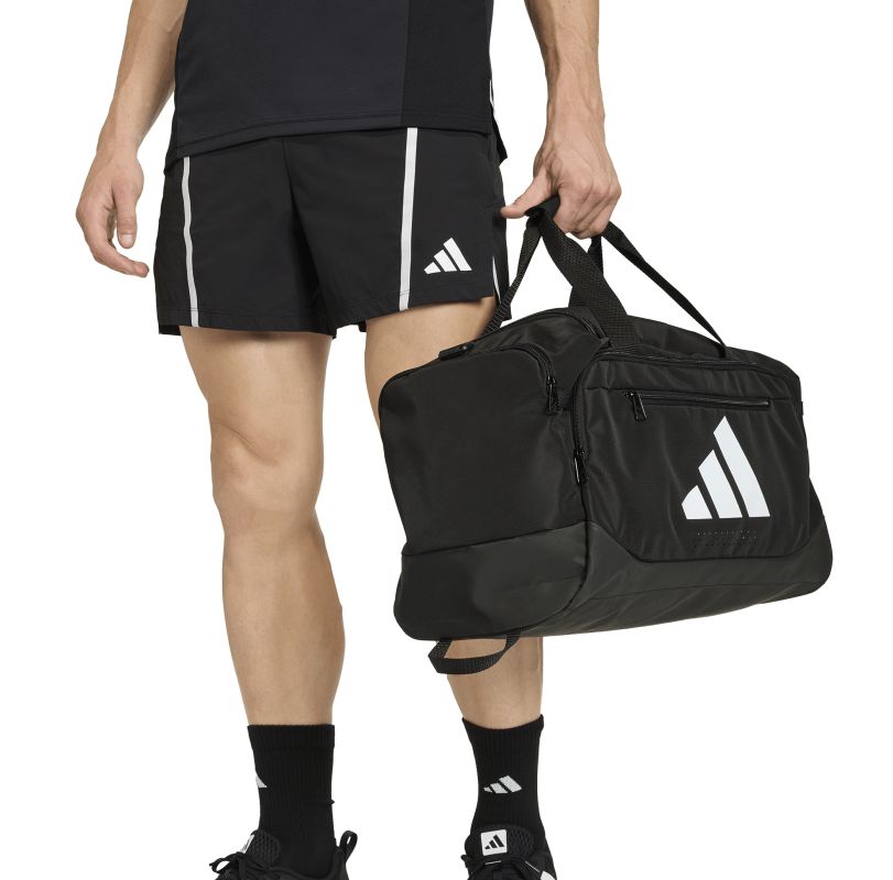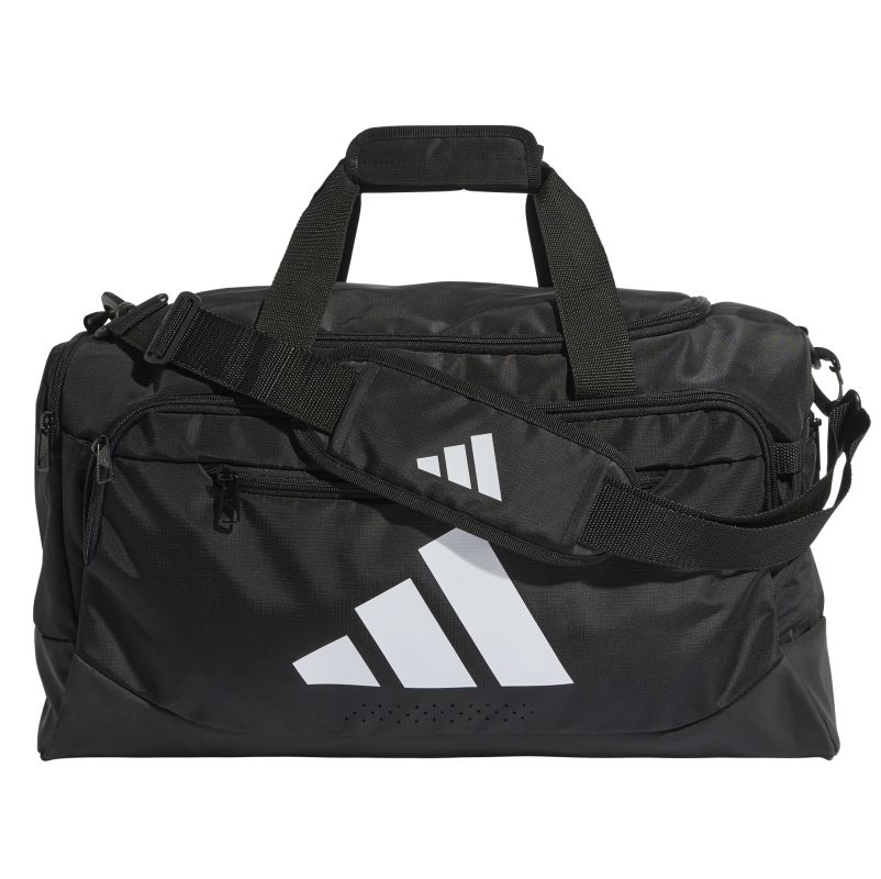 Спортивная сумка Adidas Training Defender Duffle Small - black/white. Практичная спортивная сумка объемом 42,3 л. Имеет одну главную камеру, которая вместит все необходимые вещи. Четыре внешних кармана для аксессуаров на молнии. Одна вентилируемая камера может быть предназначена для обуви или мокрой одежды. Одна регулируемая, удобная лямка и две ручки позволят удобно переносить сумку. Размеры 29,8 см x 51,8 см.