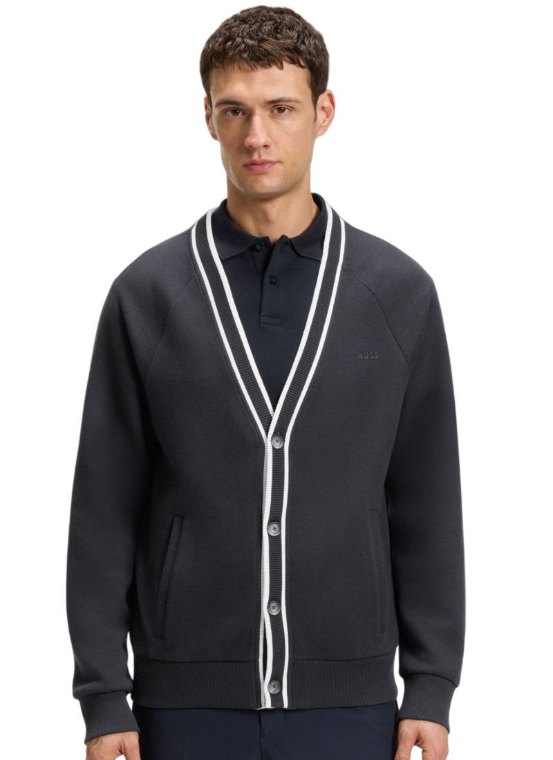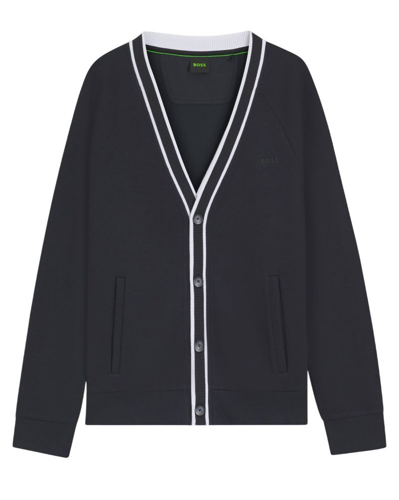 Мужская кофта BOSS Sardigan GOC - темно-синяя. Элегантная кофта с V-образным вырезом, застегивающаяся на пуговицы по всей длине. Изготовлена из высококачественных материалов, что придает кофте мягкость и нежность, а также увеличивает ее долговечность. На сайте tennis-24.ru вы найдете этот стильный вариант для повседневной носки. Имеет два сетчатых кармана с открытым доступом. Рукава и низ отделаны резинками для лучшего прилегания к телу. Идеальное дополнение гардероба для любителей классического теннисного стиля.