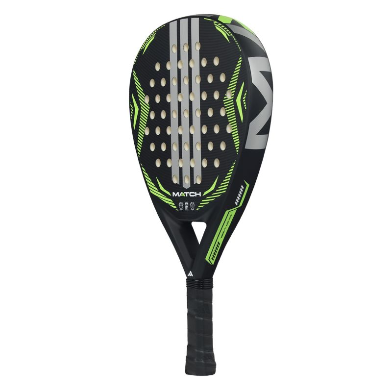 Ракетка для падел тенниса Adidas Match 2026 - black/green. Комфортная и легкая в использовании ракетка, предназначенная для начинающих игроков. Имеет увеличенную головку в наиболее гибридной форме, которая обеспечивает хорошее сочетание мощности и контроля вместе с большой зоной центрального удара. Баланс в головке предлагает дополнительные ресурсы динамики. Применение системы усилений SMART HOLES LINEAL и STRUCTURAL REINFORCEMENT улучшает жесткость ракетки, а следовательно, силу ударов. Мягкий внутренний слой из резины EVA SOFT PERFORMANCE позволяет уменьшать нежелательные вибрации.