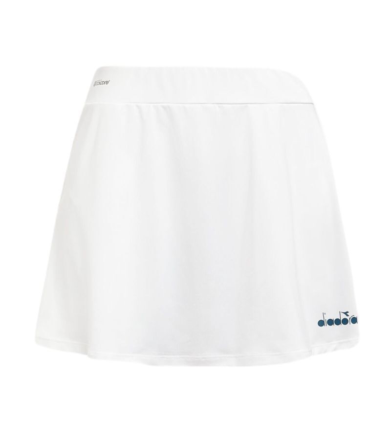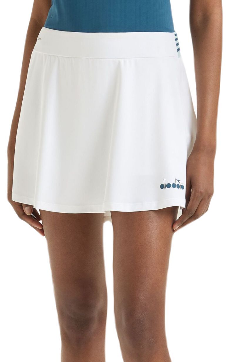Женская юбка Diadora L. Skirt Icon - optical white. Широкий, эластичный пояс позволяет хорошо подогнать изделие по фигуре и обеспечивает комфорт при носке. Встроенные внутренние спортивные шорты с карманами для мяча с обеих сторон. Передняя часть юбки выполнена из мягкого, гладкого материала, а задняя часть — из дышащего материала с использованием плиссировки. На сайте tennis-24.ru вы найдете эту модель, изготовленную из дышащего материала с применением технологии DIA DRY.