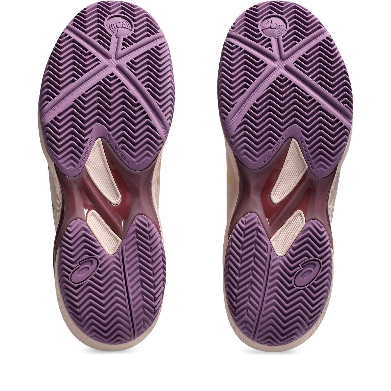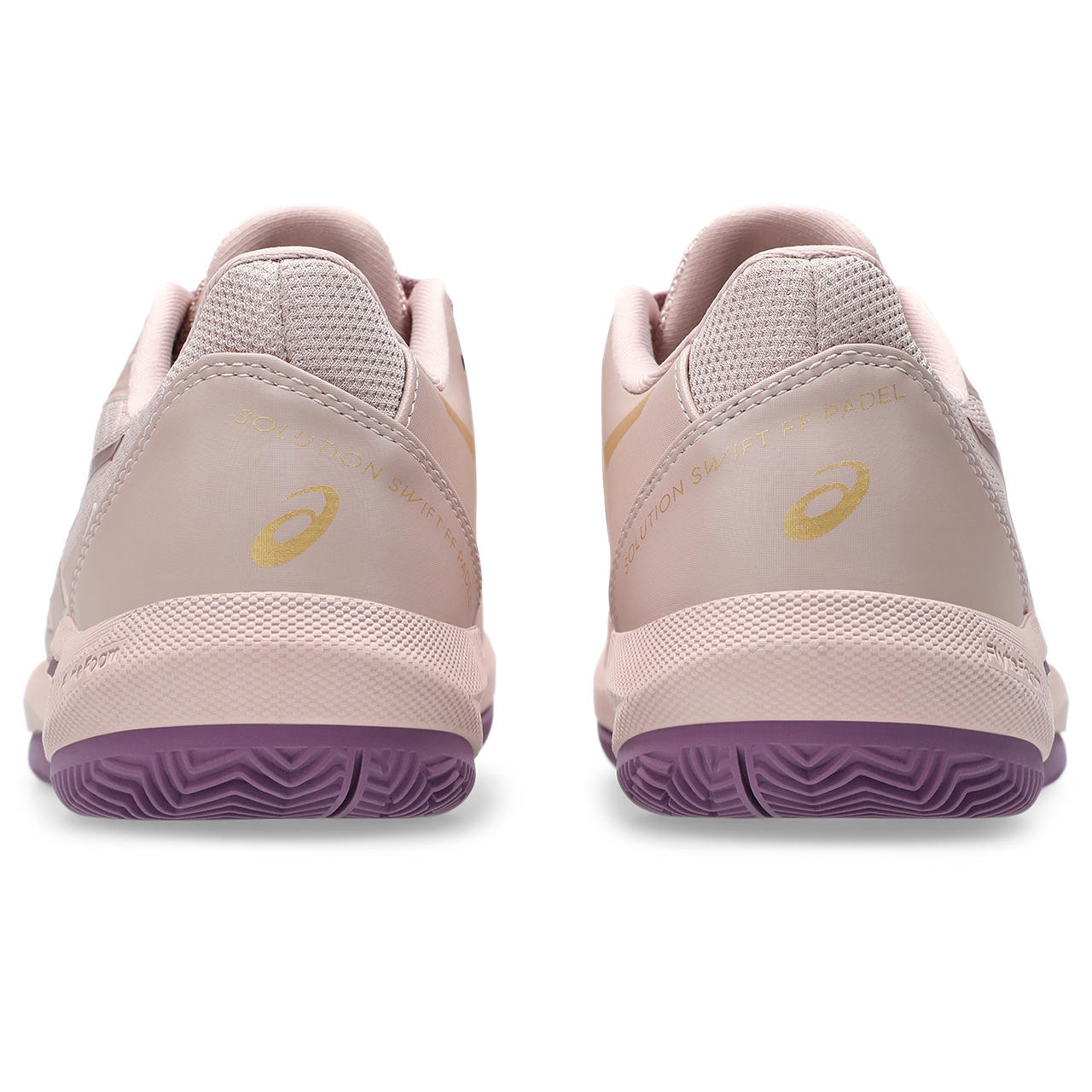 Женские кроссовки для Падел Asics Solution Swift FF 2 - neutral pink/pure gold. Отличающаяся легкостью модель Solution Swift FF позволяет добиться очень хорошего ускорения, особенно на первых этапах старта. Переработанный верх с большими зонами из сетки обеспечивает отличную воздухопроницаемость. Магазин tennis-24.ru предлагает эту модель с многочисленными усилениями в уязвимых зонах, что увеличивает прочность. Передняя часть подошвы оснащена системой PGUARD для лучшей износостойкости и защиты от механических повреждений. Средняя подошва из энергичной пены FLYTEFOAM гарантирует первоклассную амортизацию и отличный возврат энергии при отталкивании. Также применена технология TRUSSTIC, поддерживающая стабильность. Обувь оснащена подошвой, предназначенной для игры на кортах для падела.