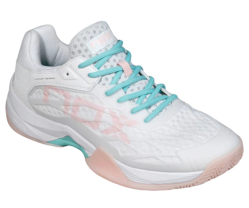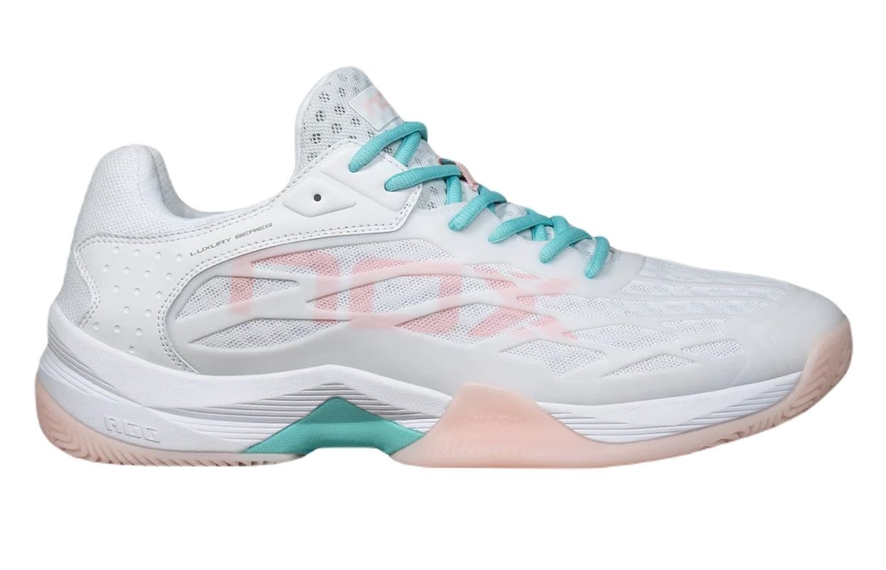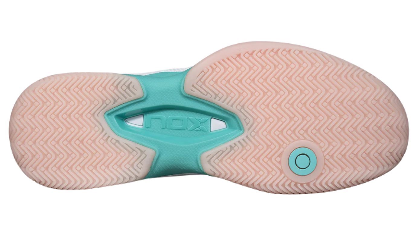 Женские кроссовки для Падел NOX AT10 Lux - white/potpurri. Буты NOX были специально разработаны, чтобы минимизировать риск травм и оптимизировать производительность игрока на корте для паделя. Протестированы в лаборатории, имеют клинические сертификаты Центра Технологии Обуви INESCOP в Аликанте, Испания. Благодаря применению технологии LATERAL SUPPORT модель AT10 Lux очень стабильна, особенно при боковых движениях. Магазин tennis-24.ru предлагает только оригинальные модели, что гарантирует высокое качество и надежность. Верх выполнен из дышащей сетки и имеет эластичные резиновые усиления ABRAXONE в наиболее подверженных истиранию зонах пальцев и по внутренней стороне стопы. Внутренняя стелька ORTHOLITE с антибактериальными свойствами и уменьшающая ощущение усталости обеспечивает отличный комфорт во время игры, а технология AGG, расположенная под пяткой, снижает перегрузки и способствует амортизации. Протектор Optimal GRIP гарантирует отличное сцепление с поверхностями для паделя.