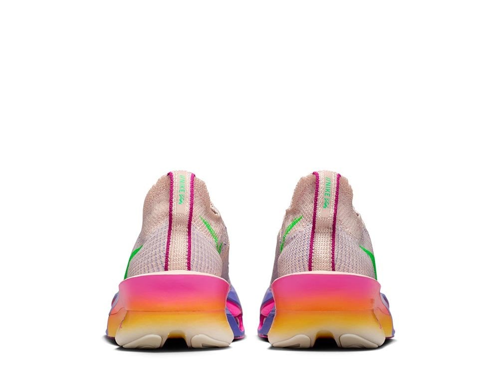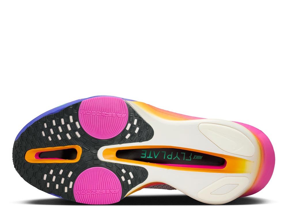 В третьей версии Alphafly изменен внешний вид, подчеркивающий большую динамику. Подошва унифицирована, а соединенная таким образом пена ZoomX обеспечивает отличную стабильность и амортизацию, что повышает комфорт во время бега. Две газовые подушки Air Zoom в передней части обуви вместе с пеной ZoomX увеличивают возврат энергии при каждом шаге. Также присутствует полноразмерная, немного более широкая пластина из углеродного волокна - Flyplate, которая обеспечивает максимальную динамику и позволяет уверенно и плавно выполнять шаги даже во время самого интенсивного бега.