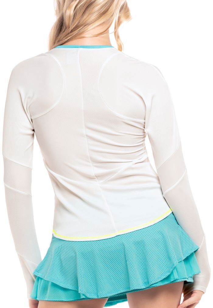 Женская теннисная футболка с длинным рукавом Lucky in Love Desert Vibes Reflect Long Sleeve — белая. Легкая, комфортная футболка с длинным рукавом и приталенным кроем. Изготовлена из эластичного и дышащего ребристого полиэстерового материала, представлена на tennis-24.ru. Рукава имеют отверстия для больших пальцев, а слегка удлиненная спинка увеличивает свободу движений. Использована технология VAPORTEX.