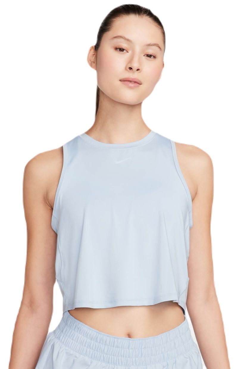 Женский топ Nike One Classic Dri-Fit Cropped Tank в цвете light armory blue с чёрными акцентами – короткая модель с широким открытым вырезом на плечах, которая гарантирует свободу движений и максимальный комфорт во время тренировок. Изготовлен из мягкой и эластичной ткани, обеспечивающей приятные тактильные ощущения и отличную посадку. Благодаря использованию технологии DRI-FIT материал отлично пропускает воздух и эффективно отводит влагу, поддерживая ощущение свежести даже при интенсивных нагрузках.