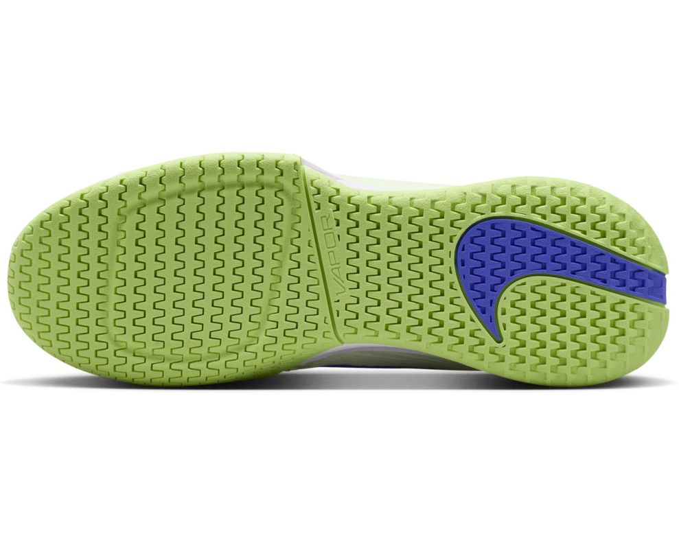 Женские теннисные кроссовки Nike Zoom Vapor Pro 3 - volt tint/sapphire lab/green white. Третья версия культовой модели Vapor Pro приносит улучшения и инновации, введенные инженерами Nike на основе предложений как профессиональных, так и любительских теннисистов. Сохранена столь ценимая исключительная легкость обуви, которая позволяет быстро перемещаться по корту, одновременно улучшая уровень поддержки стопы при молниеносных поворотах и комфорт при ношении весь день. Конструкция верха из прочной сетки гарантирует отличную воздухопроницаемость. Эластичная резиновая накладка вокруг носочной части и наиболее подверженной истиранию боковой внутренней зоны повышает долговечность. Удаление резины из зон, менее подверженных износу, минимизирует вес обуви. Язычок с частично интегрированной конструкцией с внутренней носочкой и полный ремешок в области срединной части стопы, который позволяет сильнее затянуть шнуровку, обеспечивают улучшенную посадку и более стабильное удержание стопы при резких изменениях направления. Газовая подушка ZOOM AIR, расположенная в средней подошве, предлагает отличную амортизацию с высокой упругостью шага. Кроме того, уменьшение размера подушки улучшило гибкость и сцепление передней части обуви, что облегчает естественное сгибание при отталкивании и максимизирует динамику отскока. Благодаря профилю протектора внешняя подошва универсального назначения не ограничивает возможности скольжений на различных покрытиях.
