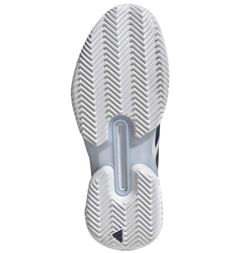 Женские теннисные кроссовки Adidas Adizero Ubersonic 5 W Clay - cloud white/dark blue/crystal sky. Пятая генерация чрезвычайно легкой и быстрой обуви Ubersonic была оптимизирована для обеспечения стабильности большей, чем когда-либо. Конструкция SPEEDFRAME, заимствованная из футбольных и регбийных ботинок, надежно стабилизирует пятку и среднюю часть стопы, гарантируя максимальную боковую поддержку при быстрых сменах направления на корте. Интегрированный плетеный язычок с профилированным воротником пятки обеспечивает идеальную посадку. Верх из тонкой сетки с большими ячейками и бесшовной конструкцией предлагает отличную вентиляцию, а вырез в наружной подошве дополнительно улучшает вентиляцию. Усиления из легкой резины ADITUFF обеспечивают повышенную защиту от износа в области пальцев при сохранении легкости. За отличную амортизацию отвечает мягкая резиновая промежуточная подошва с технологией LIGHTSTRIKE. Наружная подошва из твердой резины с технологией ADIWEAR гарантирует долговечность и сцепление. Модель оснащена подошвой для игры на грунтовых кортах.
