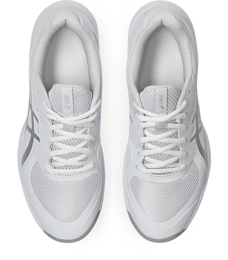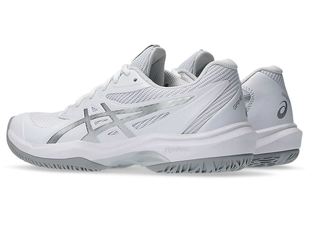 Женские теннисные кроссовки Asics Game FF - white/pure silver. Обновленная модель серии Gel-Game, предназначенная для любителей и игроков среднего уровня, ценящих легкость и комфорт, необходимые для быстрого перемещения по корту. Переработанный верх с большей эластичностью имеет многочисленные зоны из сетчатого материала для улучшенной вентиляции и обеспечивает более мягкие ощущения на стопе. Усиления в уязвимых местах гарантируют соответствующую прочность. На сайте tennis-24.ru представлен широкий выбор оригинальных кроссовок для тенниса, в том числе и данная модель. Новинкой в серии Gel-Game является применение технологии FLYTEFOAM. Этот энергичный материал в межподошве обеспечивает отличную амортизацию и динамичное отталкивание для следующего шага. При этом конструкция межподошвы сохраняет стабильность при поворотах, не увеличивая вес. Кроссовок оснащен универсальной подошвой с системой non-marking.