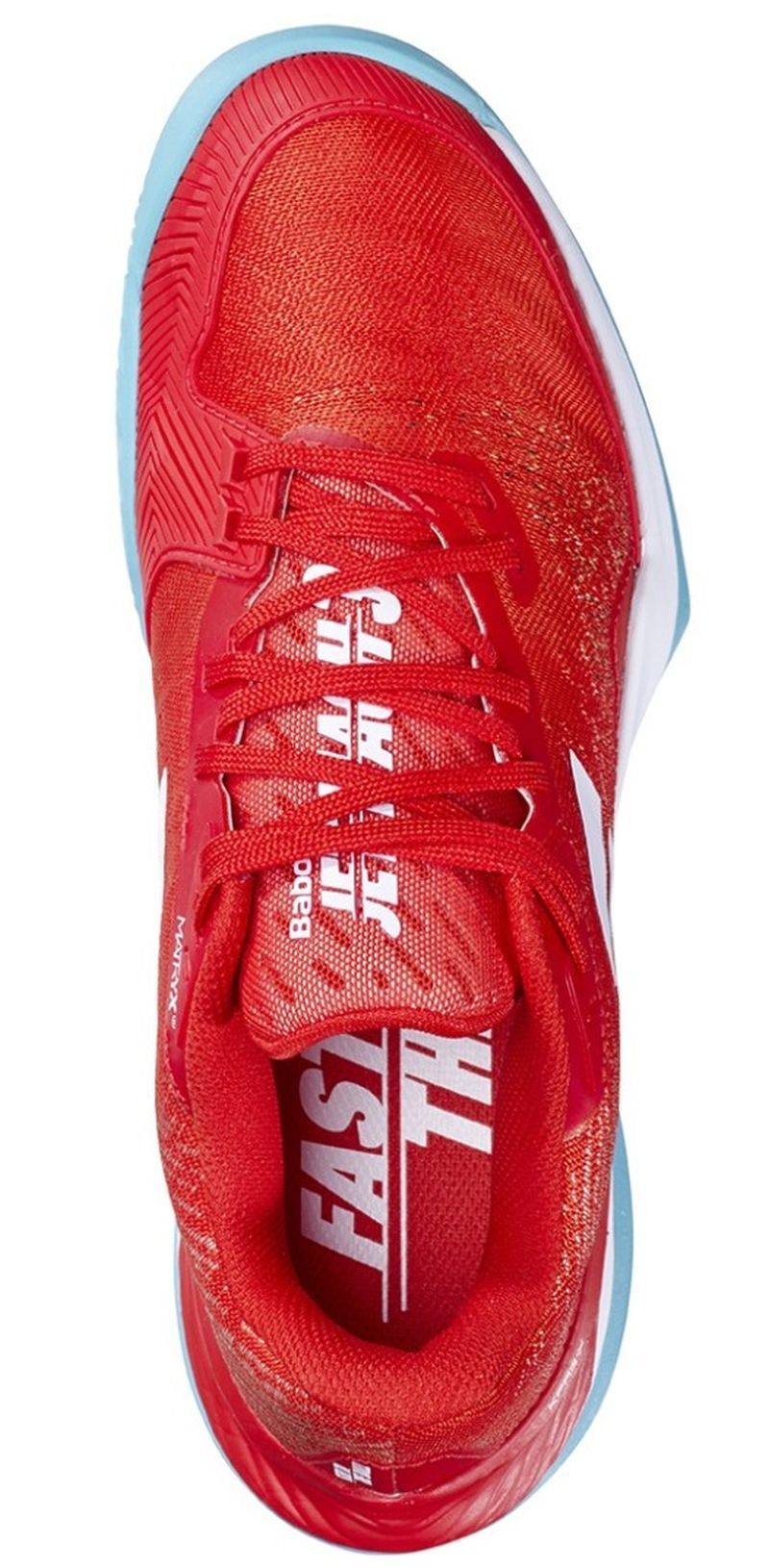 Женские теннисные кроссовки Babolat Jet Mach 3 All Court - fiesta red. Babolat Jet Mach 3 — одни из самых легких кроссовок на теннисном рынке. Мягкий сетчатый верх обеспечивает хорошую воздухопроницаемость. Еще большая стабилизация и комфорт благодаря технологии KPRS-X, расположенной под пяткой. Верхняя часть кроссовка выполнена из одного куска. Технология Matryx 2.0 делает обувь более прочной, чем у предыдущей модели. Полиамидные волокна соединены с кевларом и усилены монофиламентными волокнами, что обеспечивает чрезвычайно прочный материал и отличную поддержку стопы. Магазин tennis-24.ru предлагает только оригинальные модели с гарантией качества. Дополнительная стабилизация достигается за счет выдвижения подошвы наружу в виде так называемой «ступеньки». Более толстая внешняя подошва Michelin обеспечивает отличное сцепление. Это идеальный выбор для игроков, ищущих скорость и комфорт. Обувь с универсальной подошвой, оснащенной системой non-marking.