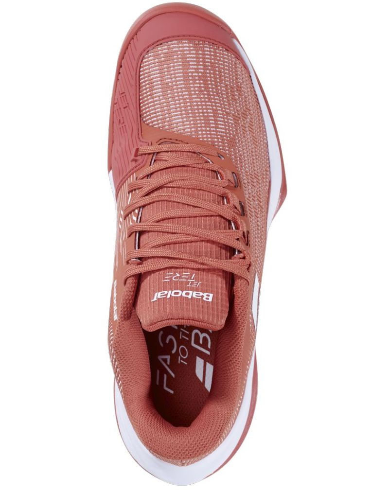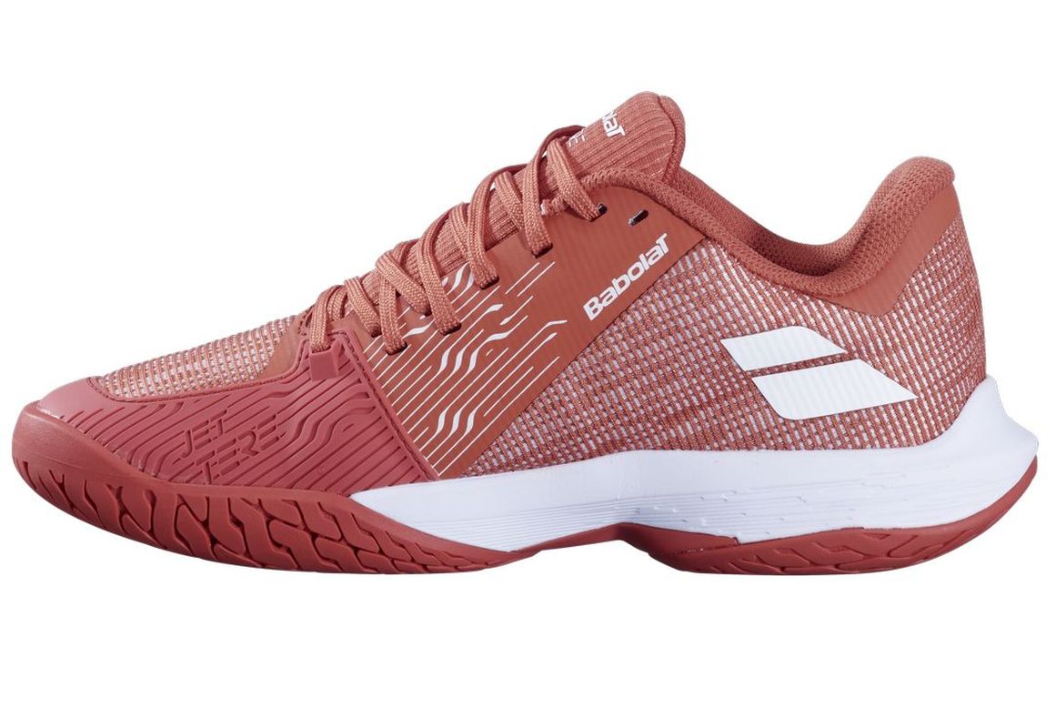 Женские теннисные кроссовки Babolat Jet Tere 2 All Court - terra cotta. Самая лёгкая модель в сегменте теннисной обуви Babolat. Разработана специально для обеспечения максимальной скорости и амортизации, одновременно гарантируя комфорт использования. Узкий крой обеспечивает идеальную посадку и отличную стабилизацию стопы. Верх из мягкой, дышащей сетки гарантирует хорошую вентиляцию. Повышенная защита пятки, высокий подъём и расширенная передняя часть подошвы повышают уровень поддержки и сцепления при резких движениях. Усиления в уязвимых зонах вокруг пальцев предоставляют дополнительную защиту. Универсальная подошва с системой non-marking — для всех типов покрытий. Применены технологии: Подошва MICHELIN PERFORMANCE, ORTHOLITE.