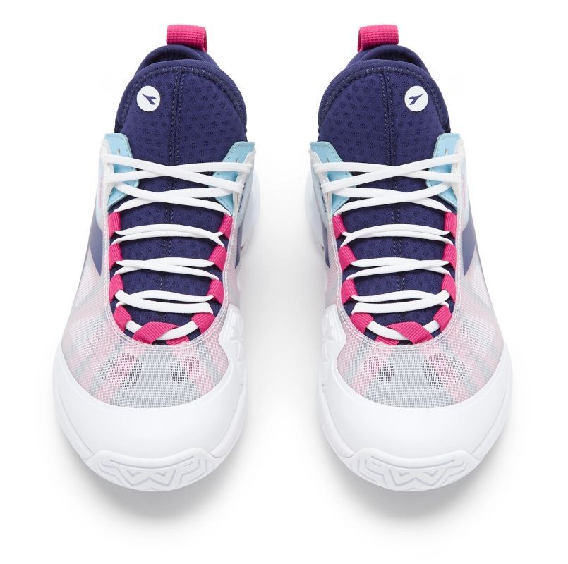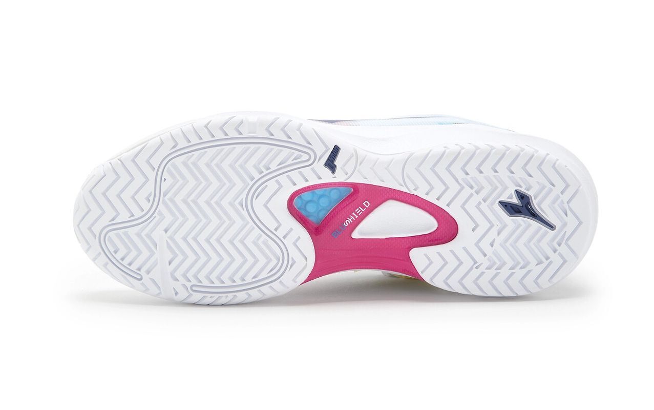 Женские теннисные кроссовки Diadora Speed Blushield Fly 4 + AG - white/blue print/pink yarr. Улучшенная версия проверенной модели Diadora Speed Blushield Fly. Обувь предназначена для игроков, ищущих гибкую, комфортную обувь с надлежащей поддержкой стопы. Верхняя часть выполнена из сетчатого материала с резиновым покрытием, обеспечивающего хорошую воздухопроницаемость. Пятка, боковые части и участки, особенно подверженные истиранию, дополнительно усилены. Стабильность и комфорт улучшают встроенный внутренний язычок и мягкая подкладка. Магазин tennis-24.ru предлагает только оригинальные модели с гарантией качества. Износостойкость и долговечность увеличивает применённая в верху технология D-Skin. Отличную амортизацию обеспечивает средняя подошва из мягкой, лёгкой и эластичной пены EVA. Технология Blushield в передней части обуви обеспечивает лучший перенос энергии, что позволяет быстрее передвигаться по корту и менять направление. Внешняя подошва с универсальным протектором из резины Duratech 5000 гарантирует отличное сцепление. Также оснащена системой non marking, которая не оставляет следов на поверхности.