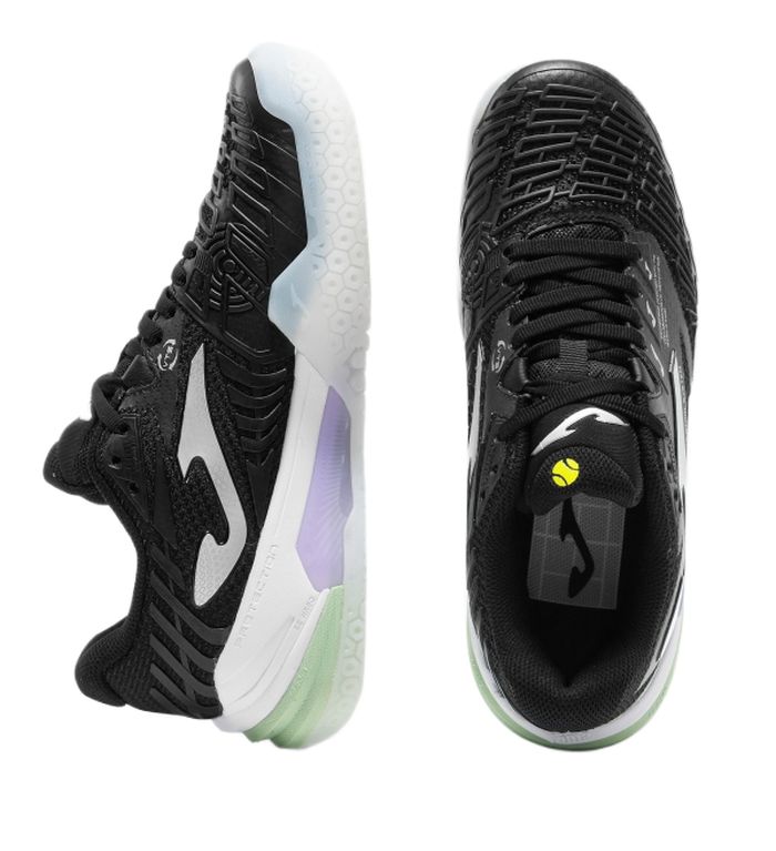 Женские теннисные кроссовки Joma Roland Lady All Court - black. Исключительно прочный и производительный модель обуви, созданный на основе тестов с профессиональными теннисистами. Имеет легкий и дышащий верх из сетки с вязаной отделкой, с перфорациями VTS, обеспечивающими оптимальную вентиляцию. Резиновые усиления PROTECTION вокруг пальцев гарантируют большую долговечность и дополнительную защиту. Система термической адаптации JOMA SPORTECH идеально подгоняет обувь под стопу без увеличения веса. Средняя подошва выполнена из филоновой пены двойной плотности DUAL REACTIVE, которая сочетает высокую реактивность с превосходной амортизацией. Кроме того, расположенный в зоне средостопья элемент STABILIS повышает боковую стабильность в этой области. Прочная наружная подошва из резины DURABILITY обладает универсальным рисунком протектора, подходящим для различных видов теннисных покрытий.