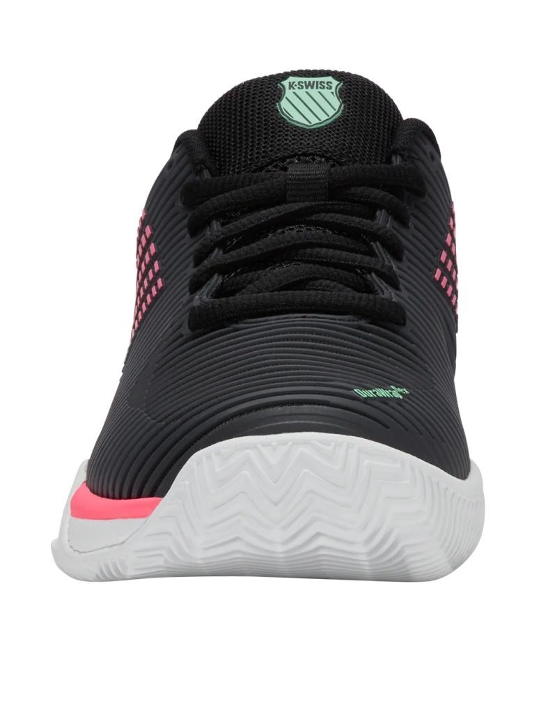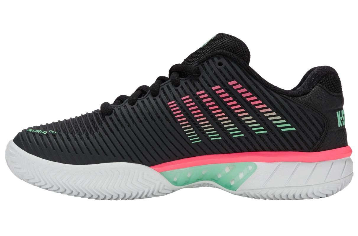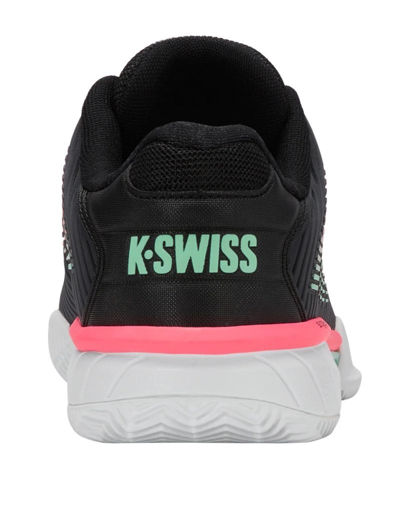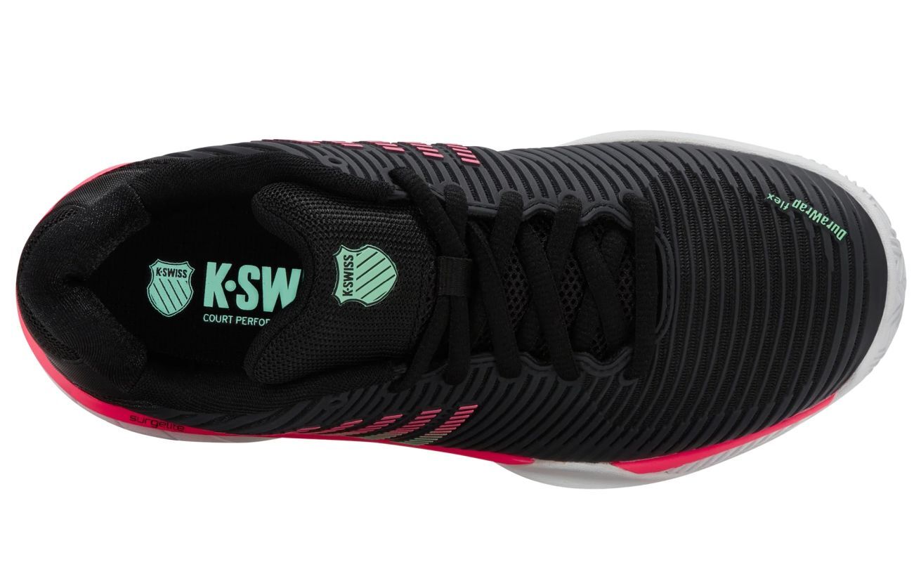 Женские теннисные кроссовки K-Swiss Hypercourt Express 2 Clay - black/white/neon mint. Модель легкая и быстрая, одновременно предлагающая универсальный комфорт. Спроектирована для амбициозных, агрессивно играющих спортсменок. Верх выполнен так, чтобы быть еще более гибким и обеспечивать отличную поддержку, что делает эту обувь позволяющей преодолевать границы. Это плавный переход от предыдущей версии, поскольку новая модель сочетает в себе больший комфорт с ощущением стабильности на корте. Внешняя подошва обеспечивает хорошее сцепление и износостойкость. Использованы технологии: AOSTA 7.0, CMEVA, DurawrapFlex, Surge 7.0 для максимальной боковой поворачиваемости и Dragguard 7.0, повышающая долговечность подошвы. Средняя подошва Surgelite обеспечивает оптимальную амортизацию и поддержку стопы. Внешняя подошва с системой non-marking и измененным рисунком протектора «елочка» обеспечивает эффективность и хорошее сцепление на глиняной поверхности.