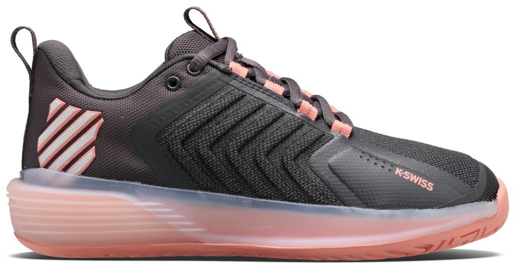 Женские теннисные кроссовки K-Swiss Ultrashot 3 Women - asphalt/peach amber/white. Самая прочная и стабильная модель из серии K-Swiss. Дышащий верх из сетки обеспечивает поддержку и комфорт, а также усилен для защиты стоп от натираний на жестком корте при скольжении, а мягкая пятка гарантирует плотную посадку и полную стабильность. Средняя подошва предлагает исключительно мягкую, упругую пену, обеспечивающую динамичную амортизацию под ногами. Внешняя подошва хорошо работает на всех покрытиях корта и разработана для максимальной прочности без утяжеления. Технологии DuraMesh и No Sew Slidegaurd обеспечивают комфорт, поддержку и долговечность на жестком корте. DuraWrap в особо изнашиваемых местах для увеличения прочности. Средняя подошва: амортизация Surge 7.0 — исключительно мягкая, отзывчивая, легкая и долговечная. Верх из TPU в средней части стопы обеспечивает стабильность при самых быстрых движениях. Внешняя подошва — прочная резиновая подошва Draggaurd 7.0 с модифицированным рисунком "елочка" увеличивает прочность и сцепление на любом покрытии корта. Также применена технология 360 PSC.